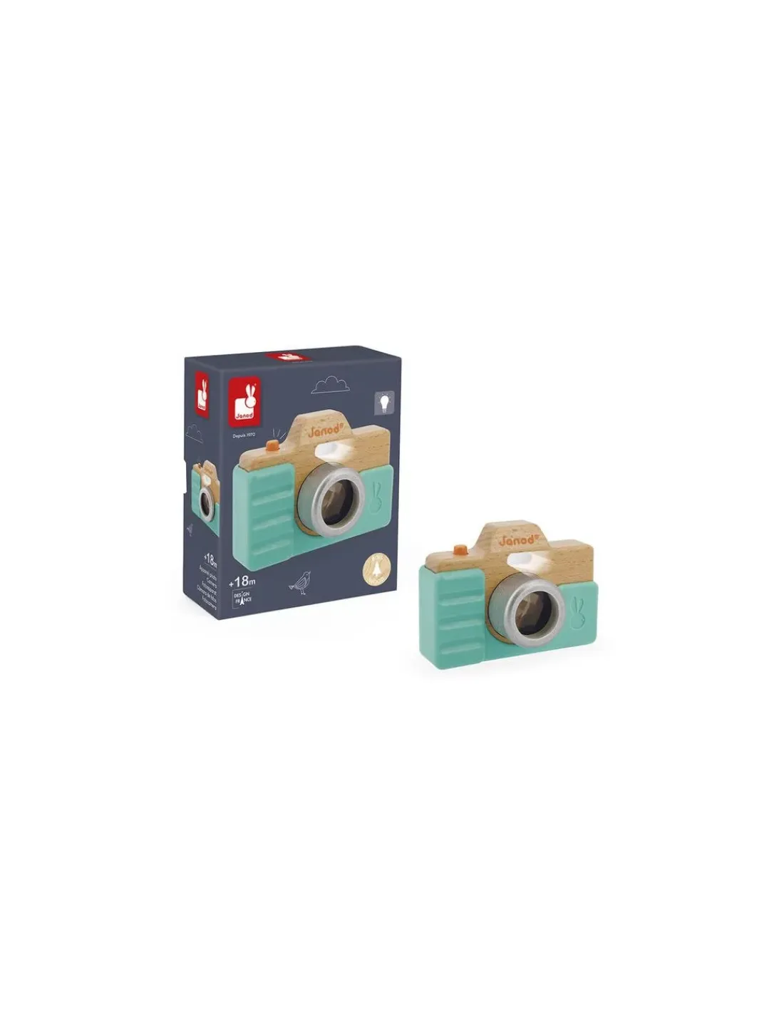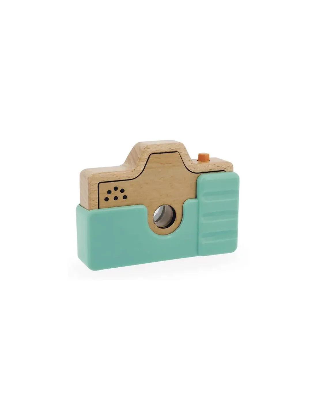 Un jouet d’éveil en bois avec une coque en silicone turquoise qui réserve plein de surprises aux enfants dès 18 mois. En appuyant sur le déclencheur, vous entendrez le son de la prise de vue comme pour un authentique appareil photo. Un vrai flash illuminera également le modèle… de quoi s’imaginer en pleine séance photo! Enfin, à travers le viseur kaléidoscope, l’enfant découvrira des formes et des couleurs extraordinaires qui feront rire petits et grands.