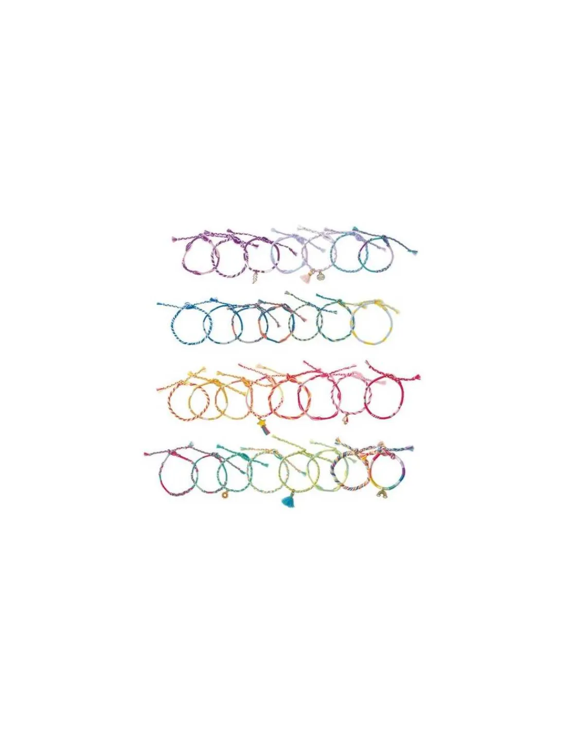 Ce coffret créatif contient 12 échevettes de fils de coton pastel de 17m, 2 charms pompons, 1 pince à épiler, 10 anneaux de raccord et 6 breloques.