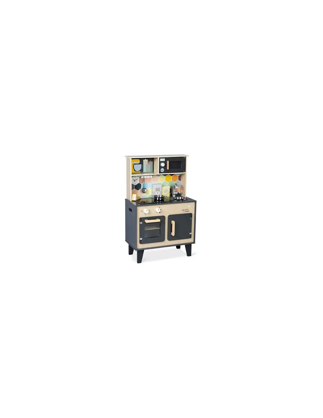 Découvrez la cuisine Mozaïc de Janod, une cuisine en bois pour préparer de bons petits plats. Cette cuisine en bois naturel aux couleurs mixtes et à la crédence ornée d’hexagones, comprend également des accessoires pour cuisinier, ainsi que du son et de la lumière.