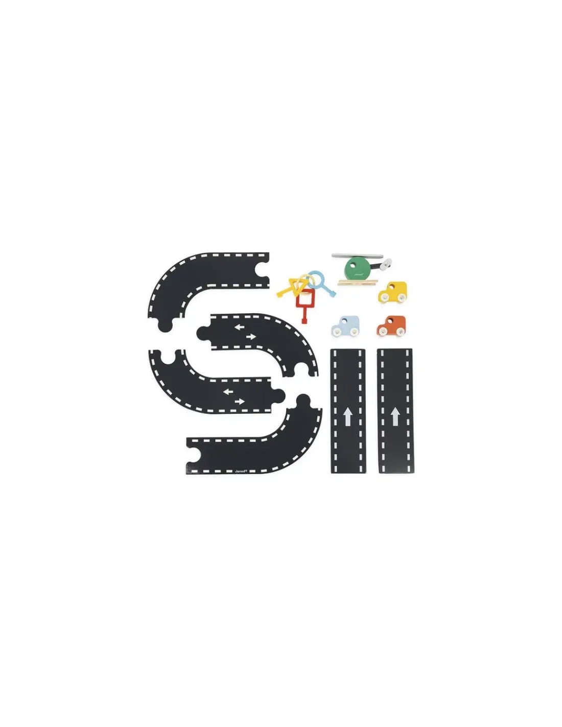 Ce garage est équipé d’un ascenseur mécanique, d’une fonction « boite à clés » au premier étage avec 3 portes à ouvrir avec 3 serrures géométriques différents (rond, triangle et carré) et 3 clés en plastique ainsi que 3 voiture et un hélicoptère en bois pour jouer avec son garage.