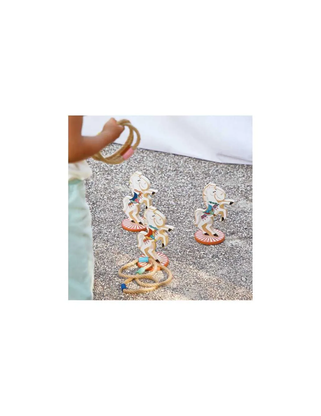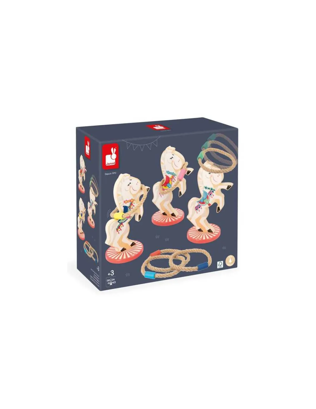 Découvrez le jeu d’anneaux Chevaux de la collection Applepop de Janod, un jeu d’adresse en bois sur le thème de la fête foraine pour les enfants dès 3 ans. Ce jeu comprend 3 chevaux et 6 cordes à lancer.