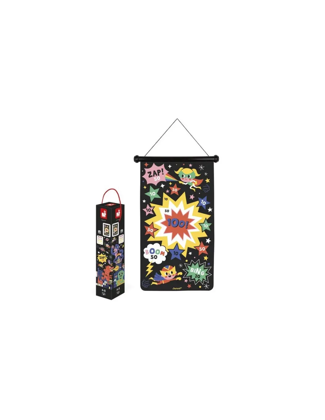 Découvrez le jeu de fléchettes magnétique Super-héros de Janod, un jeu réversible sur le thème des personnages aux super-pouvoirs. Un jeu de fléchettes pour les enfants de 4 à 8 ans, livré avec 6 fléchettes en plastique (3 rouges et 3 jaunes) et équipé d’une ficelle en coton pour le suspendre.