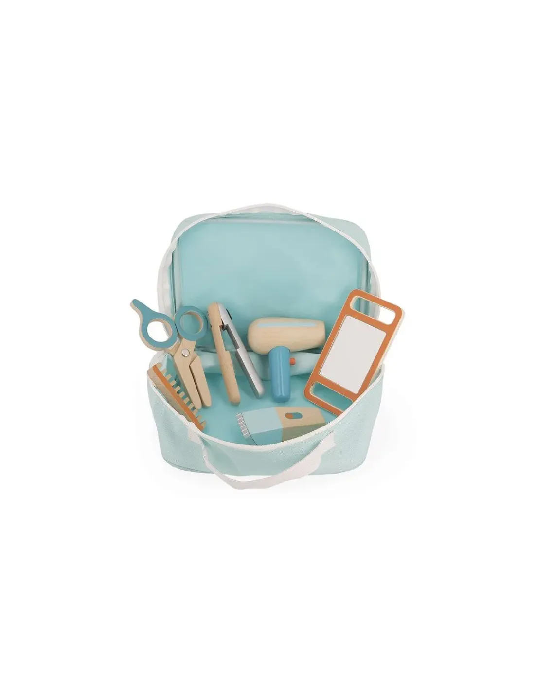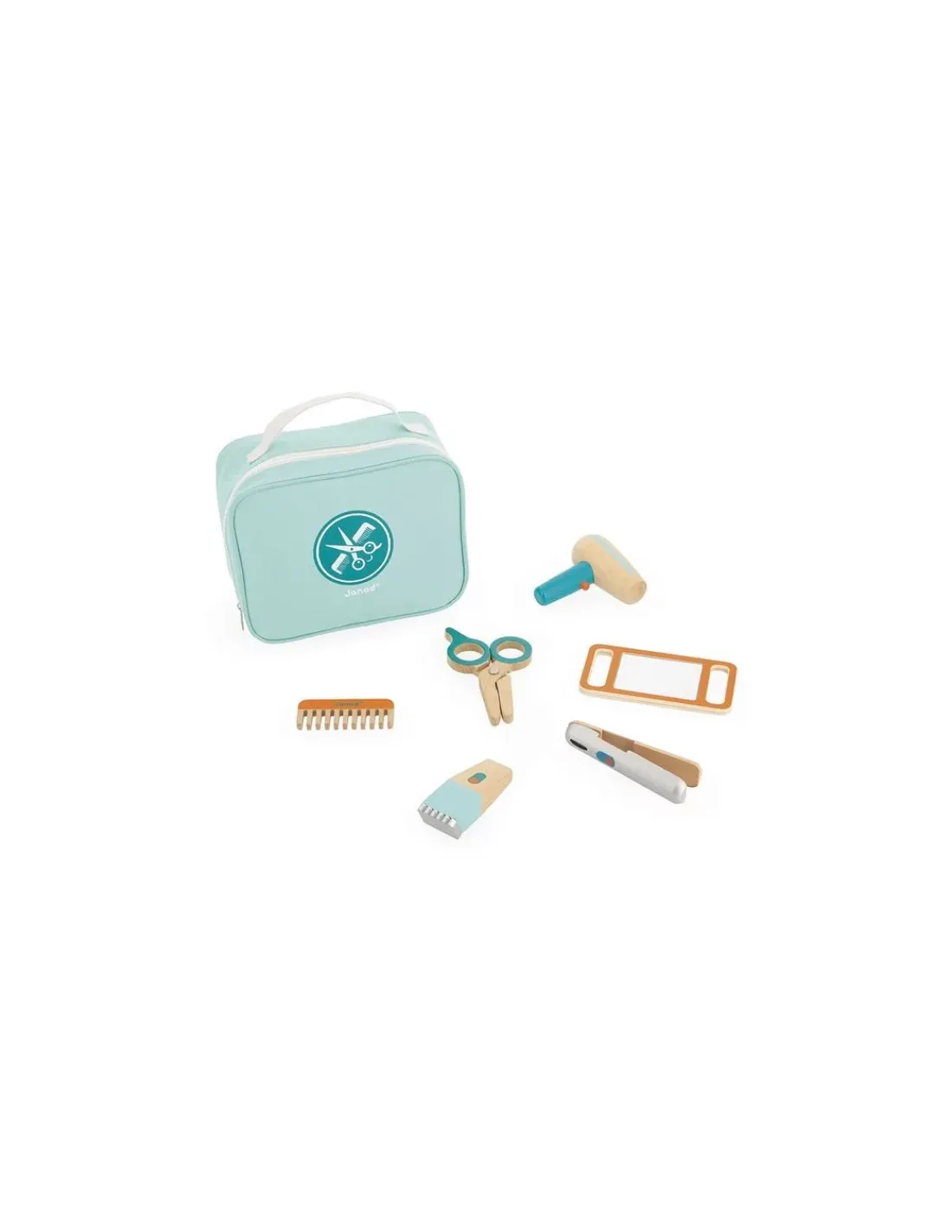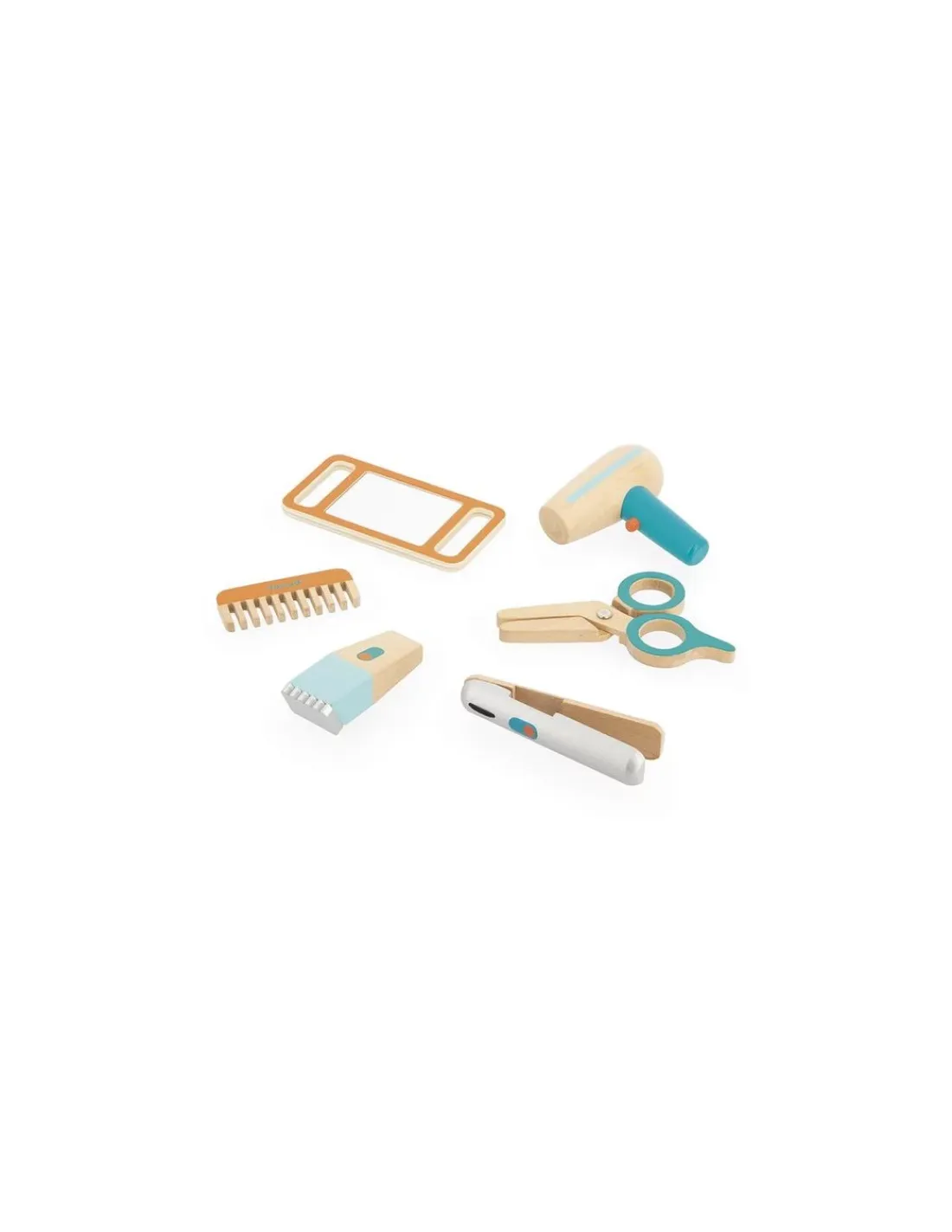 Ce coffret complet renferme 6 jouets en bois pour que votre enfant puisse imiter les gestes de son papa et de sa maman et être le plus beau : un peigne, un lisseur, un sèche-cheveux, une tondeuse, des ciseaux et un miroir.