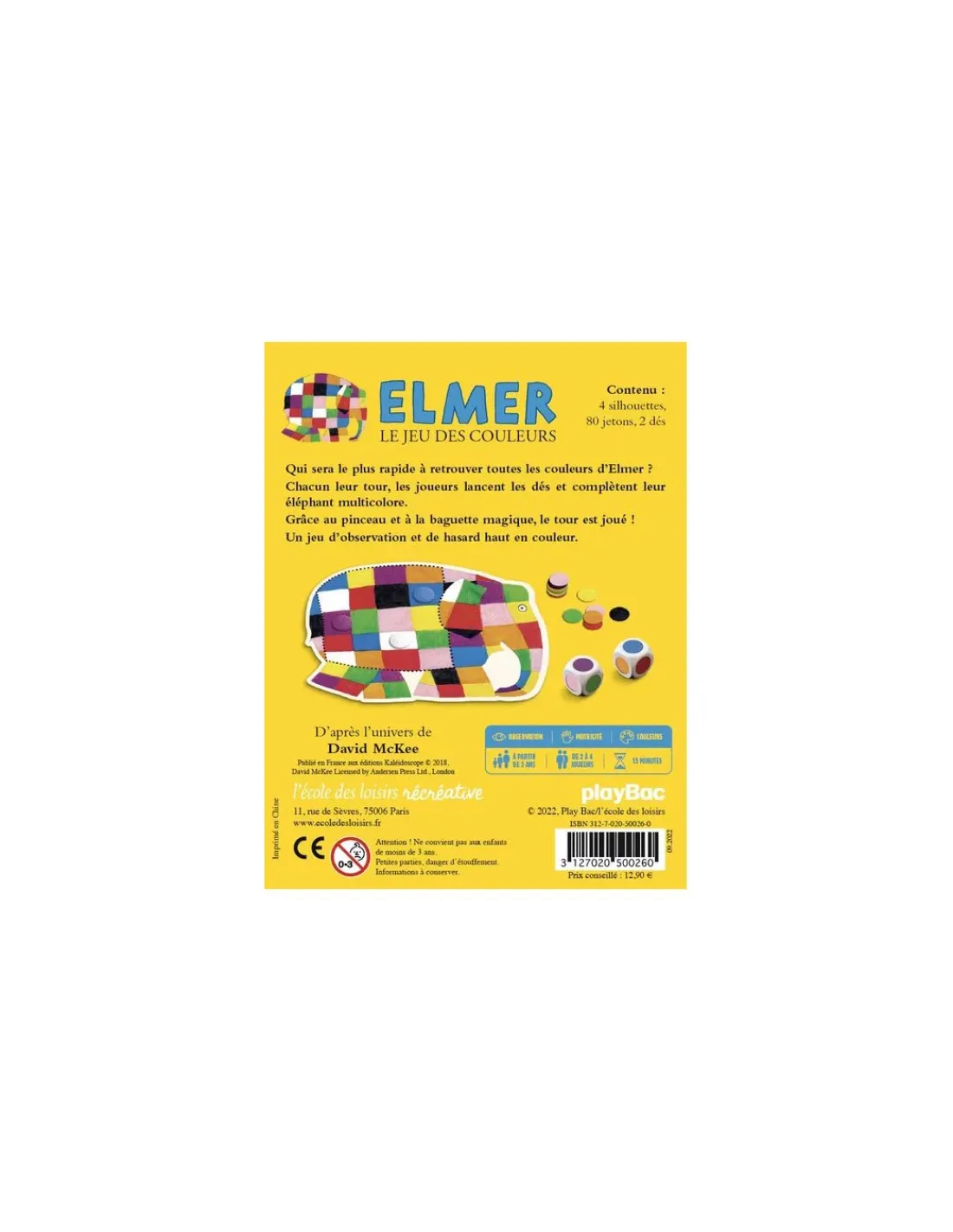 Qui sera le plus rapide à retrouver toutes les couleurs d’Elmer? Chacun leur tour, les joueurs lancent les dés et complètent leur éléphant multicolore. Grâce au pinceau et à la baguette magique, le tour est joué! Le joueur qui a rempli sa silhouette Elmer en premier remporte la partie.