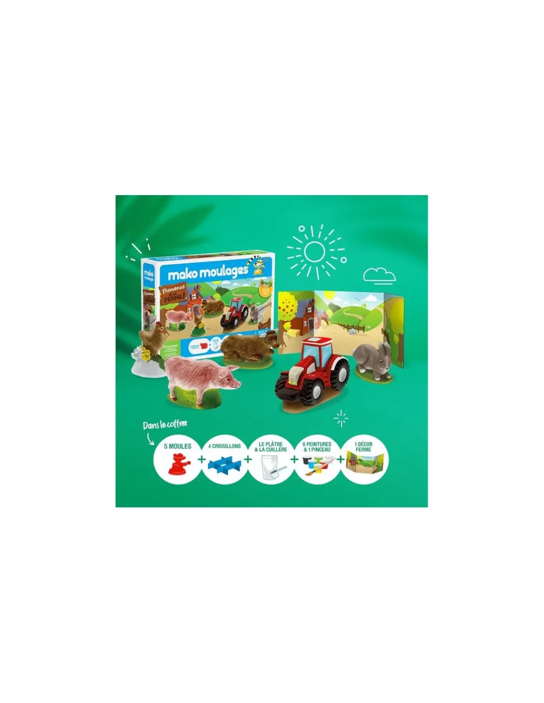 Découvrez le coffret 5 moules Bienvenue à la ferme Mako moulages, un coffret fabriqué en France pour les enfants dès 5 ans. Un coffret créatif pour mouler, démouler et peindre! Amuse-toi à reproduire l’univers intégral de la ferme, avec ses animaux de la basse-cour, ses champs… et le tracteur, bien sûr!