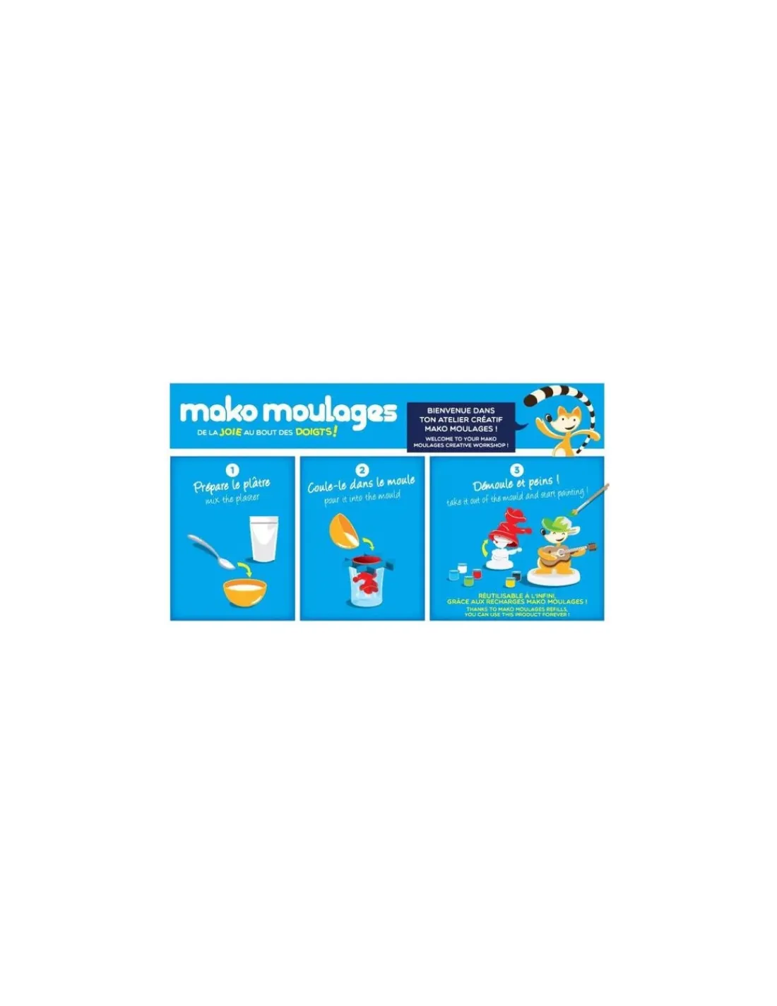 Une activité créative autour du moulage et de la peinture, un cadeau parfait pour les enfants créatifs. Préparez le plâtre en suivant les instructions, coulez-le doucement dans le moule, puis démoulez la figurine et peignez-la au gré de vos envies.