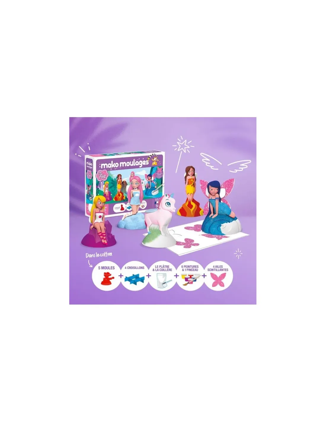 Découvrez le coffret mes fées Mako moulages, 5 figurines féeriques en plâtre à mouler et à décorer pour les enfants à partir de 6 ans. Un coffret fabriqué en France, une activité créative autour du moulage et de la peinture, un cadeau parfait pour les jeunes filles créatives. Il était une fois, dans les contrées lointaines du monde de Mako moulages, 4 merveilleuses fées puisant leur pouvoir au coeur des 4 éléments de la nature: Jade la fée de la Terre, Alba la fée de l’air, Lyz la fée du feu, Marina la fée de l’eau et Mipou la licorne magique.