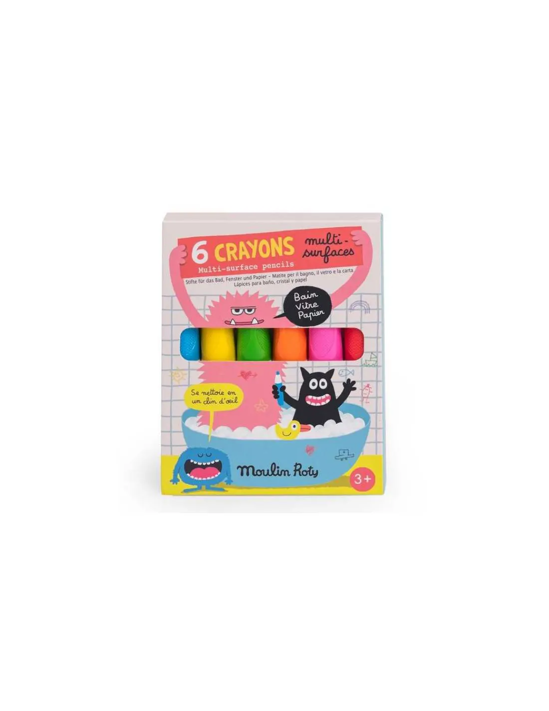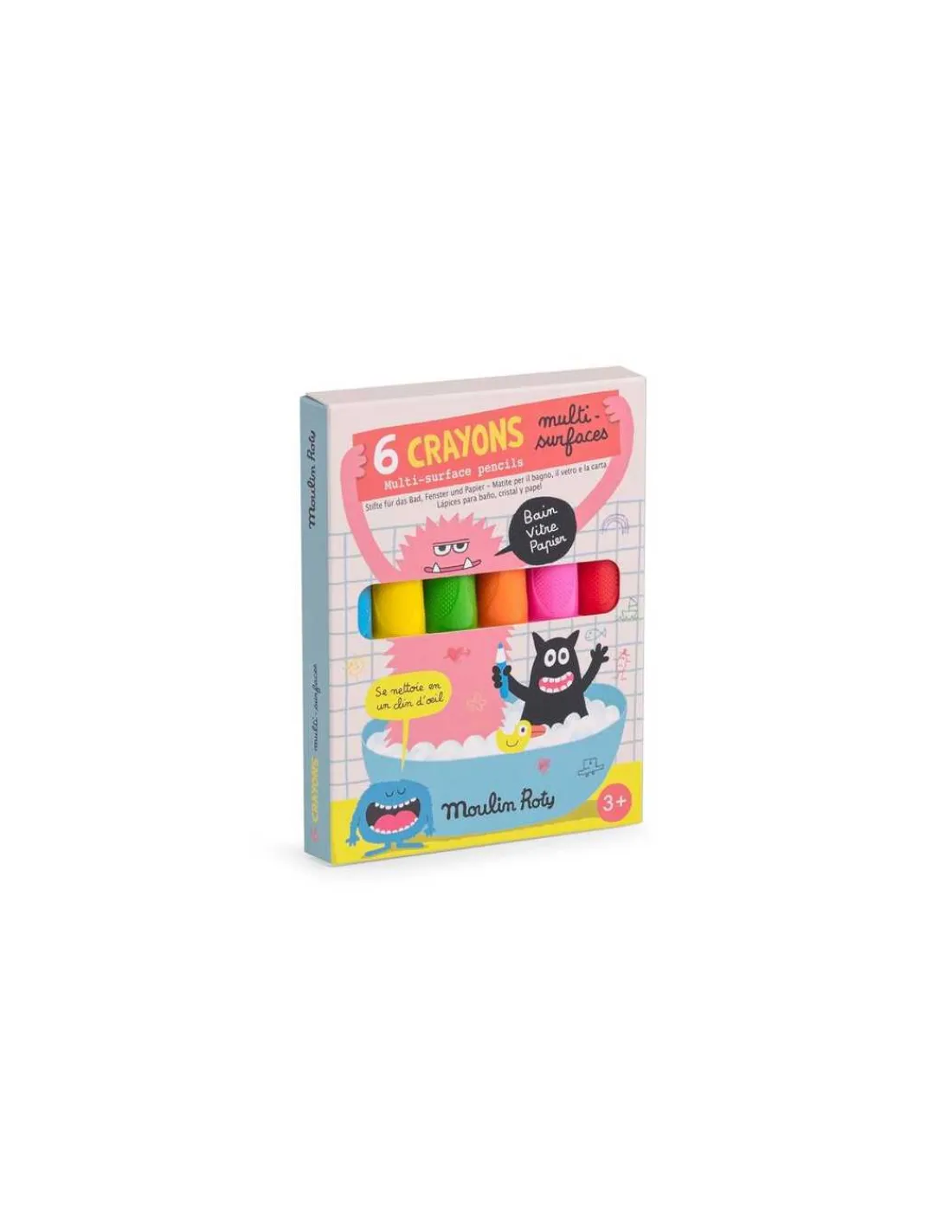 Découvrez la pochette de 6 crayons multisurfaces de la collection Les Schmouks de Moulin Roty, 6 crayons aux couleurs pétillantes parfaits pour écrire sur les vitres, dans le bain ou sur du papier pour un effet aquarelle.