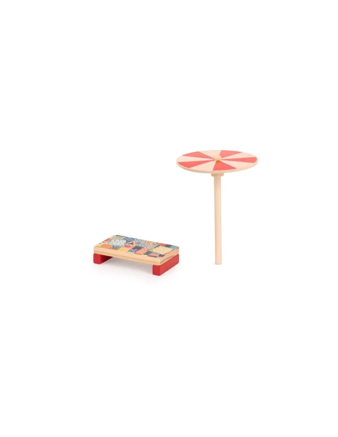 Cette année, la Grande Famille part en vacances dans sa caravane! Tout en bois, cette jolie roulotte comprend un ensemble de mobilier, des rideaux en tissu vichy et un toit amovible pour les nuits étoilées. Elle peut être associée à la voiture week-end grâce à son attache-remorque.