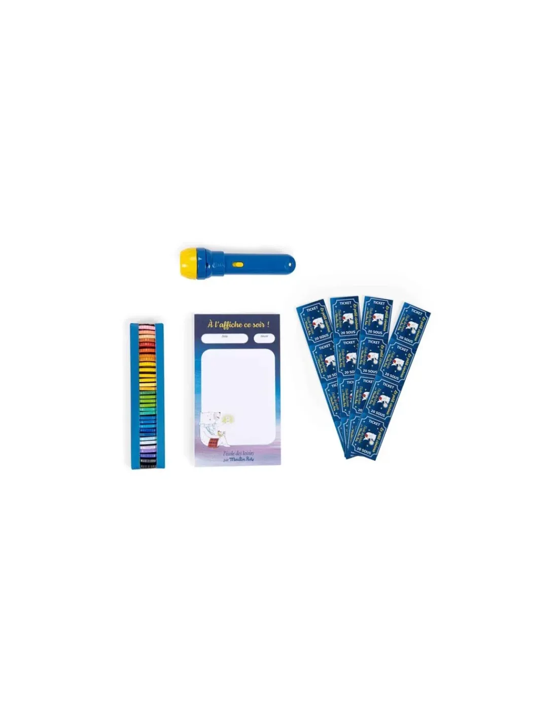 Annoncez le programme, récupérez les tickets de place de cinema et projetez le film choisi parmi les 32 histoires disponibles après avoir éteint la lumière.
