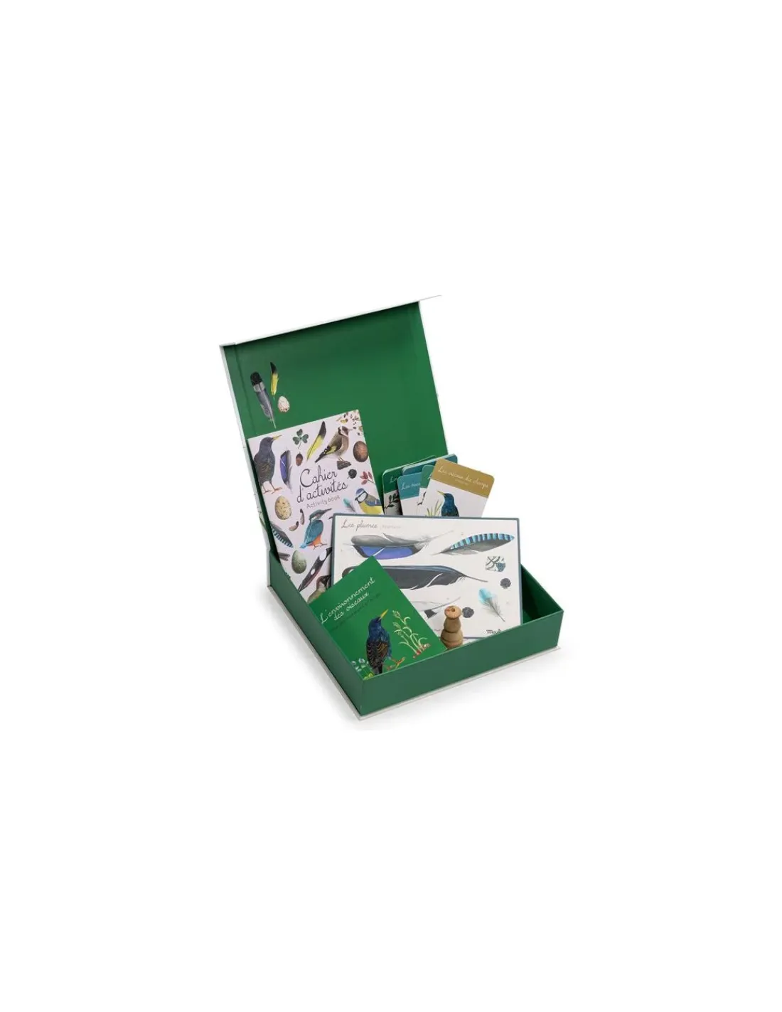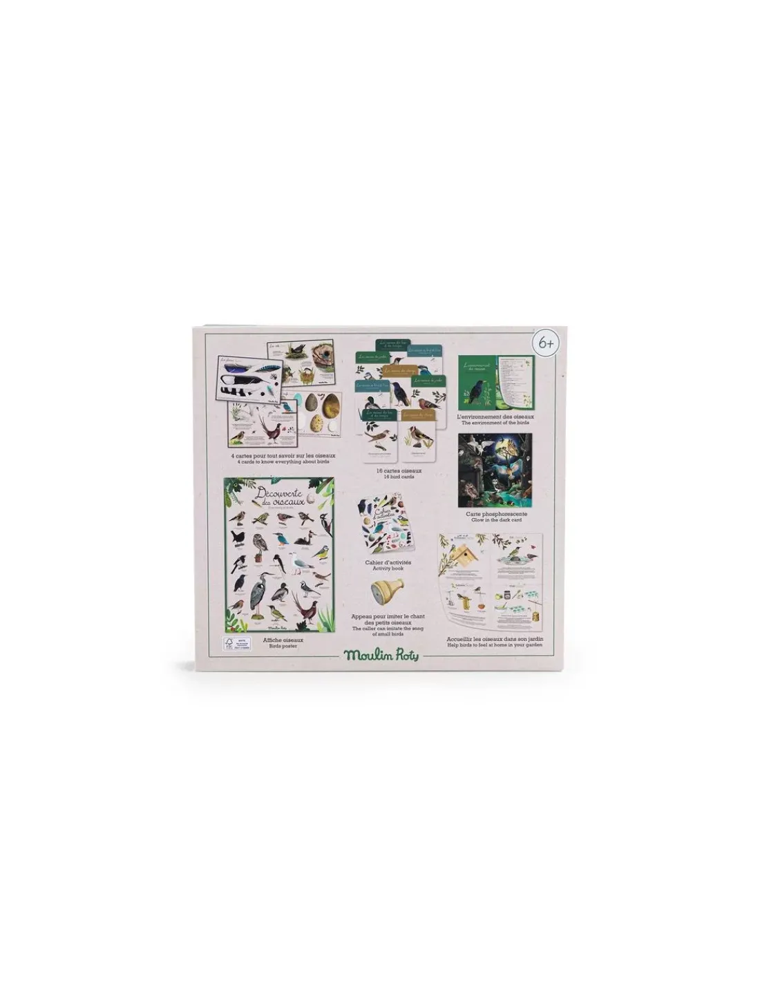 En ouvrant la boite, vous découvrirez 26 accessoires : des cartes d’identification, des portraits d’oiseaux, un appreau pour imiter les oiseaux, une carte nocturne phosphorescente, un cahier d’activités, une affiche sur les oiseaux, une notice pour aider les oiseaux, un dépliant…