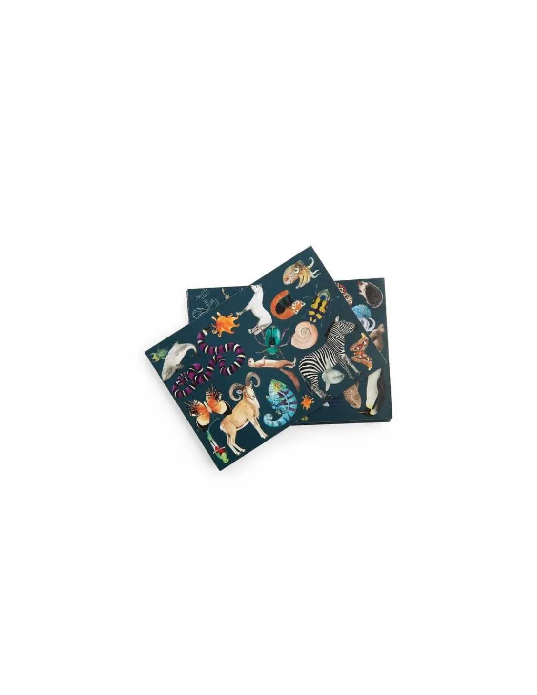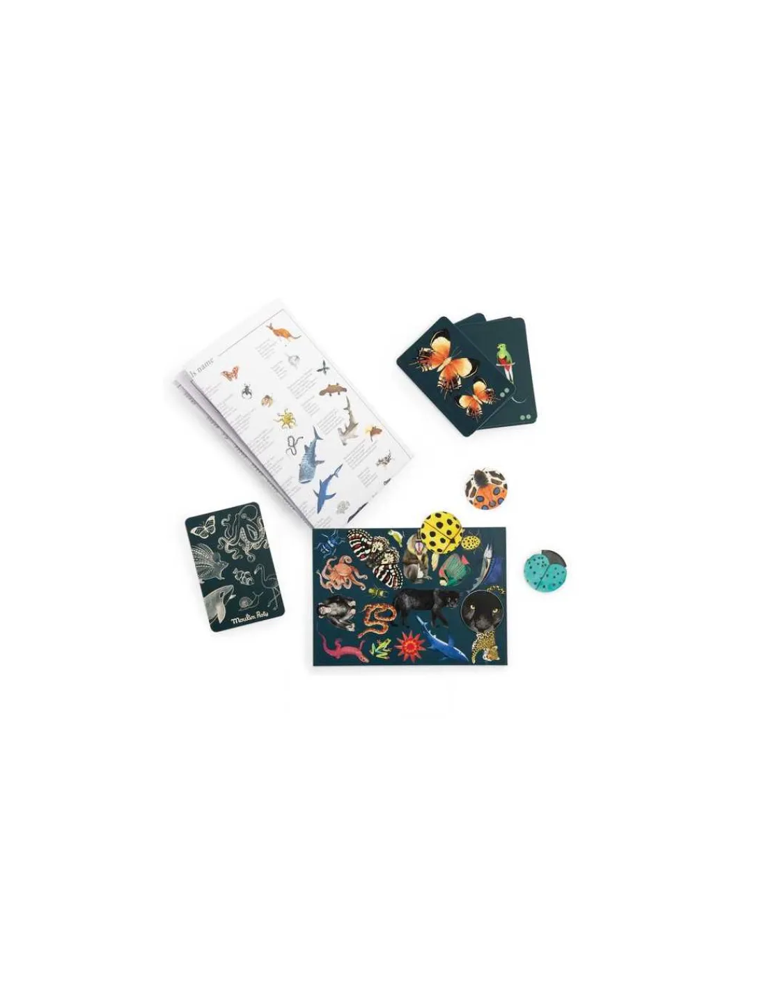 Pour pimenter le jeu et gagner plus de points, piochez une carte curiosité. A chaque partie, changez le plateau de jeu en modulant les 9 planches. Un poster avec le nom des animaux est inclus.