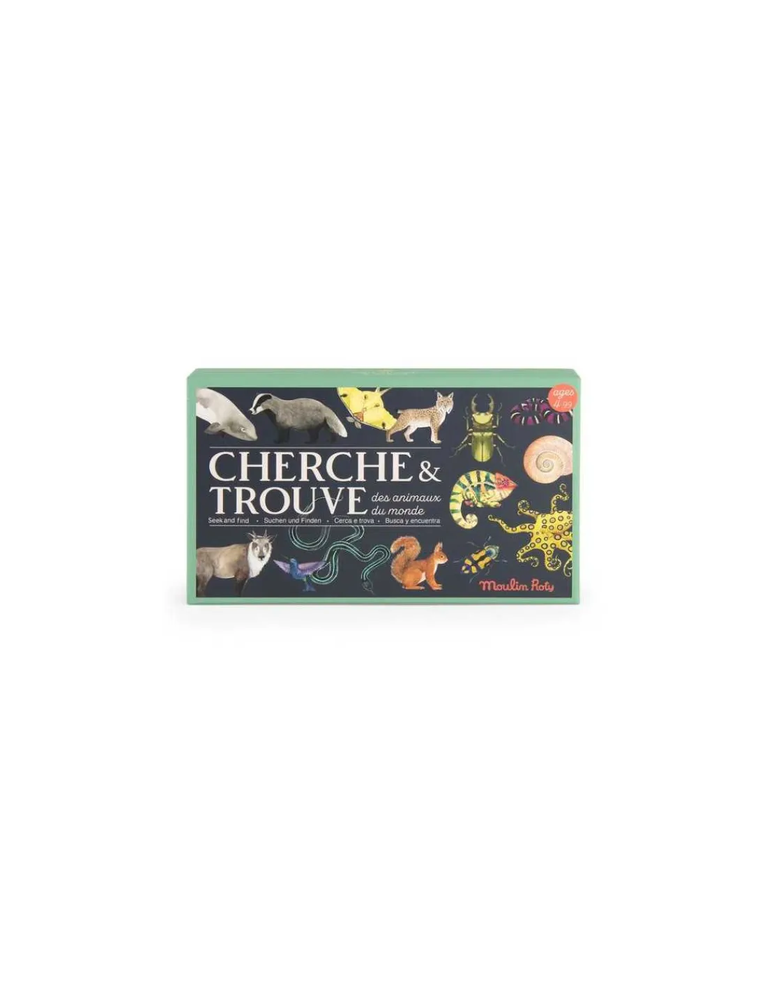 Découvrez le jeu cherche et trouve de la collection Tout autour du monde de Moulin Roty, un jeu éducatif pour découvrir les animaux à partir de 4 ans. Un coffret fabriqué en France où vous devrez trouver les animaux du monde le plus vite possible !
