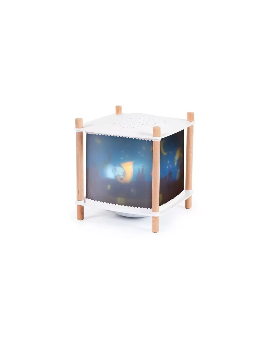 En fonction veilleuse apaisante: lorsque vous l’allumez, un film tourne devant les yeux apaisés et ébahis de votre enfant. En fonction projecteur d’étoiles: une fois activée, cette fonction permet à la lanterne de projeter des étoiles au plafond comme si votre chambre se transformait en ciel étoilé. En fonction veilleuse musicale: 4 berceuses sont préenregistrées et vous avez la possibilité de diffuser d’autres histoires ou musiques de votre choix grâce à la connexion sans fil. En fonction détecteur de pleurs: la veilleuse se rallume automatiquement quand la fonction est activée.