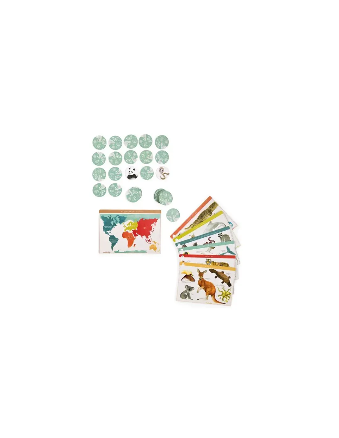 Joliment illustré, ce loto contient 6 planches continents recto-verso et 60 jetons. Le premier joueur à avoir complété entièrement sa ou ses planches remporte la partie.