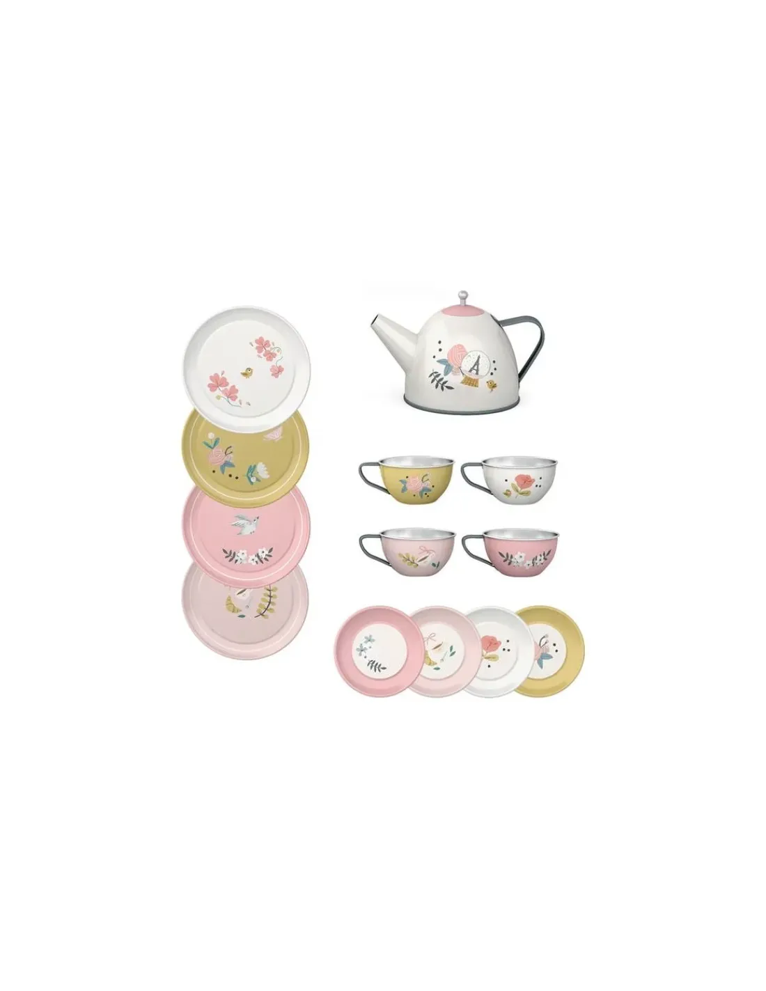 Une dinette en métal aux couleurs poudrées, aux motifs fleuris et illustrations délicates et raffinées de Lucille Michieli sur Paris. Elle comprend un plateau, une théière, quatre assiettes à dessert, quatre tasses et quatre soucoupes assorties.