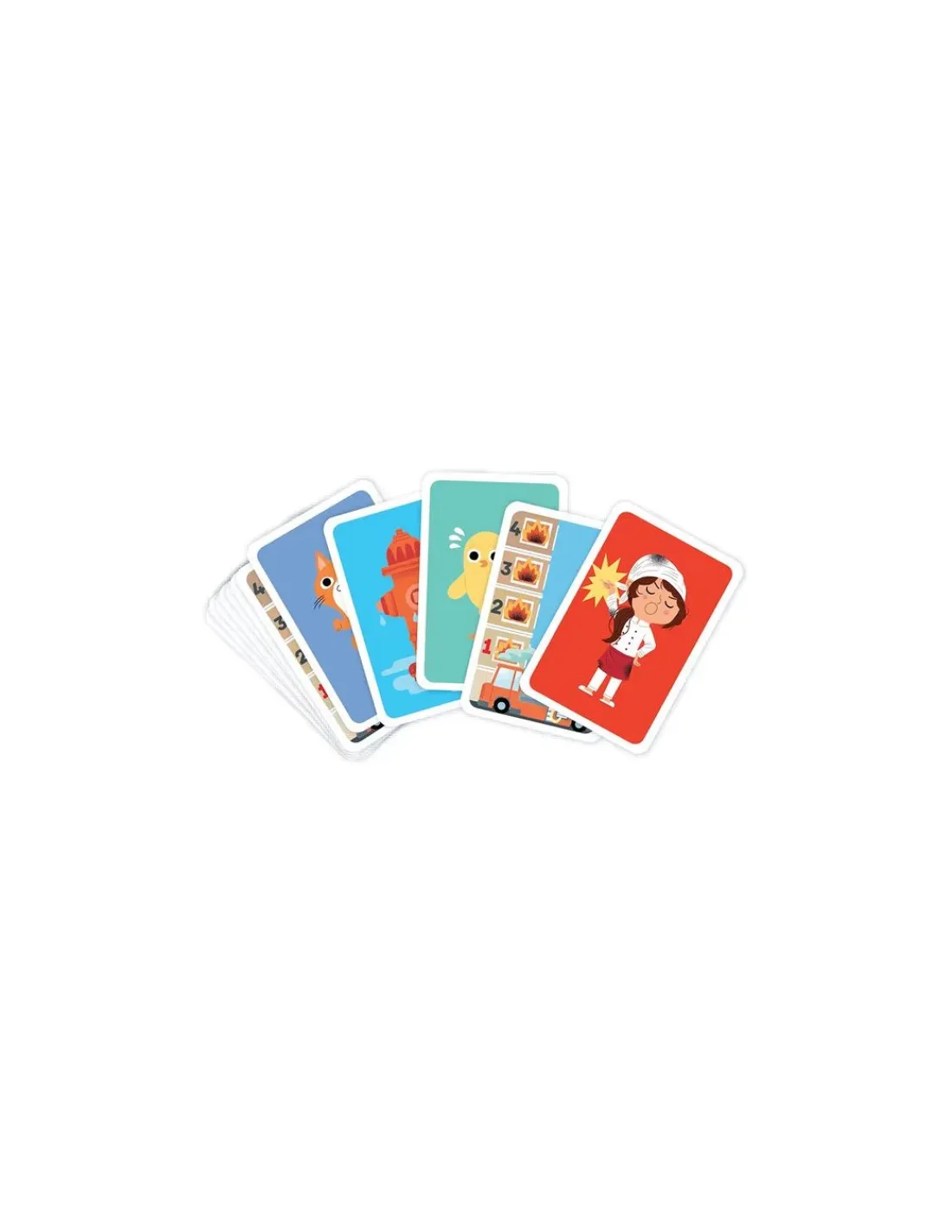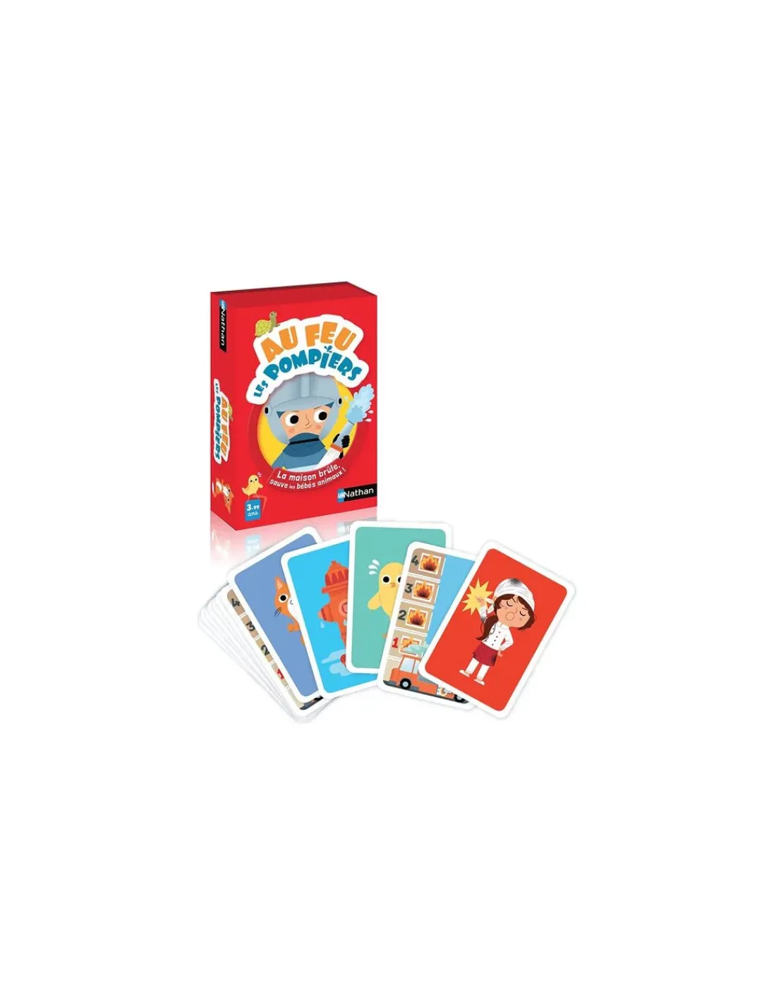 Découvrez le jeu de cartes Au feu les pompiers de Nathan, un jeu de bataille revisité pour les enfants à partir de 3 ans, qui vont s’amuser à sauver des flammes, un maximum de bébés animaux. Un jeu idéal pour les fans de la comptine et des pompiers.