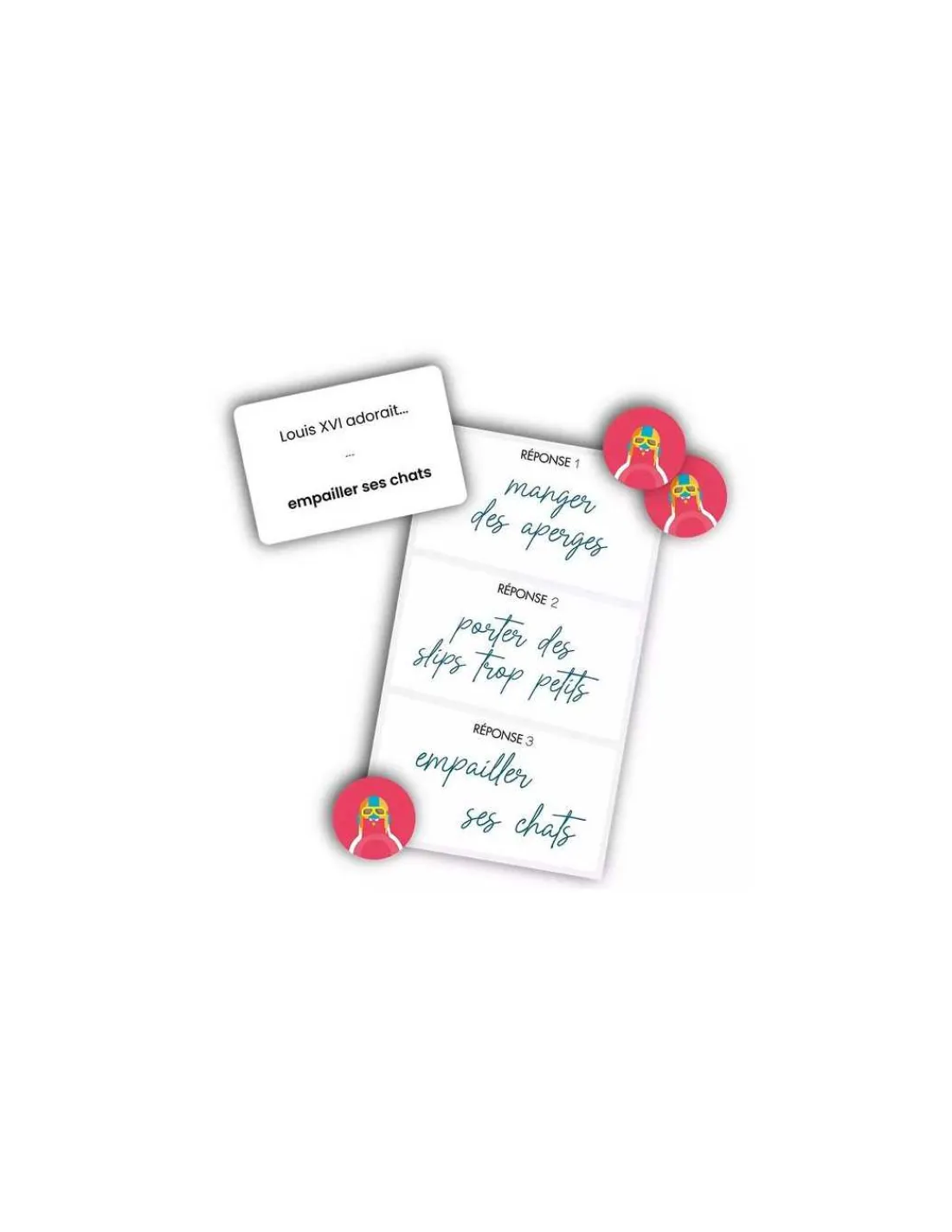 Le jeu contient 440 cartes questions, 32 jetons pigeon, 1 bloc réponse et la règle du jeu.