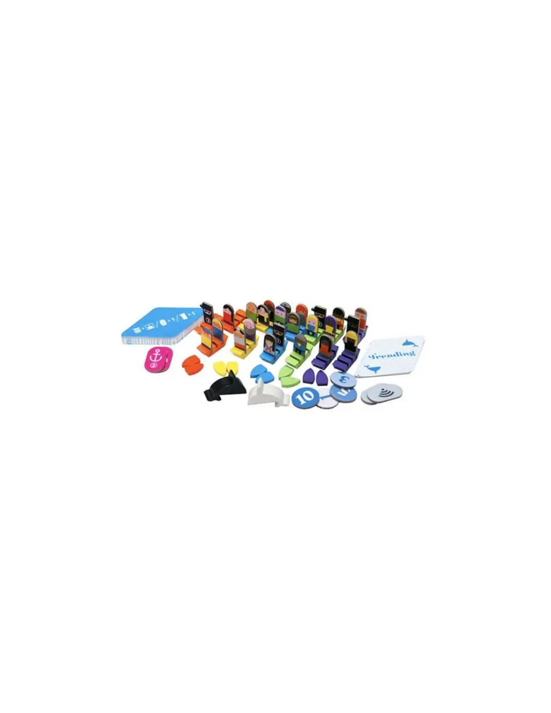 Le jeu contient 27 cartes en forme de losange, 15 bateaux, 25 marqueurs d’enquête, 1 jeton « Baleine », 1 jeton « Orque » et 65 jetons (de différents types).