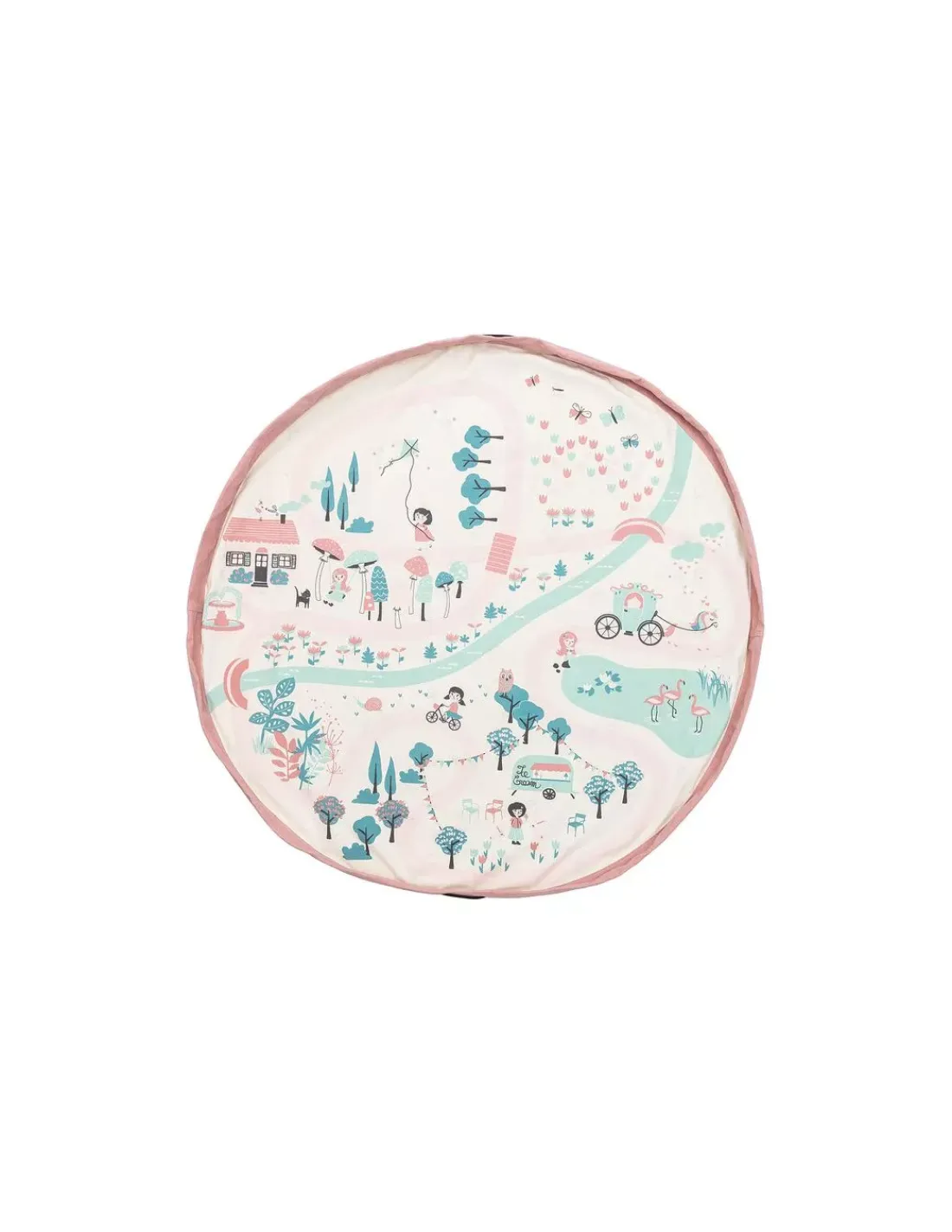 Ouvrez le sac et étalez le sur le sol, sur la plage ou dans le jardin et jouez sur ce tapis comme sur un tapis de jeu illustré avec un parc! Puis quand vous aurez fini, serrez les liens pour tout transporter sans rien faire tomber. Un sac astucieux pour ranger en un clin d’oeil tous les jouets de votre enfant, un sac que vous emporterez en week-end, en vacances, chez mamie…