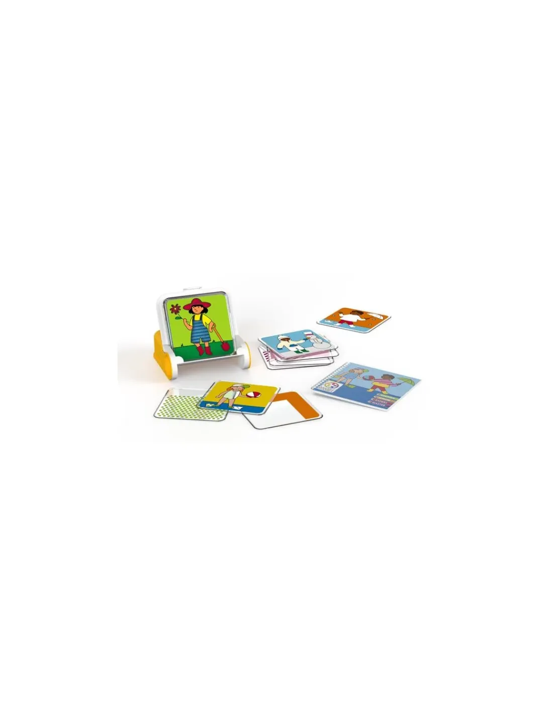 Le jeu contient 1 socle de jeu qui sert aussi au rangement, 8 tuiles transparentes avec des motifs et des couleurs, 4 tuiles personnages et 1 livret de 80 défis et leurs solutions.