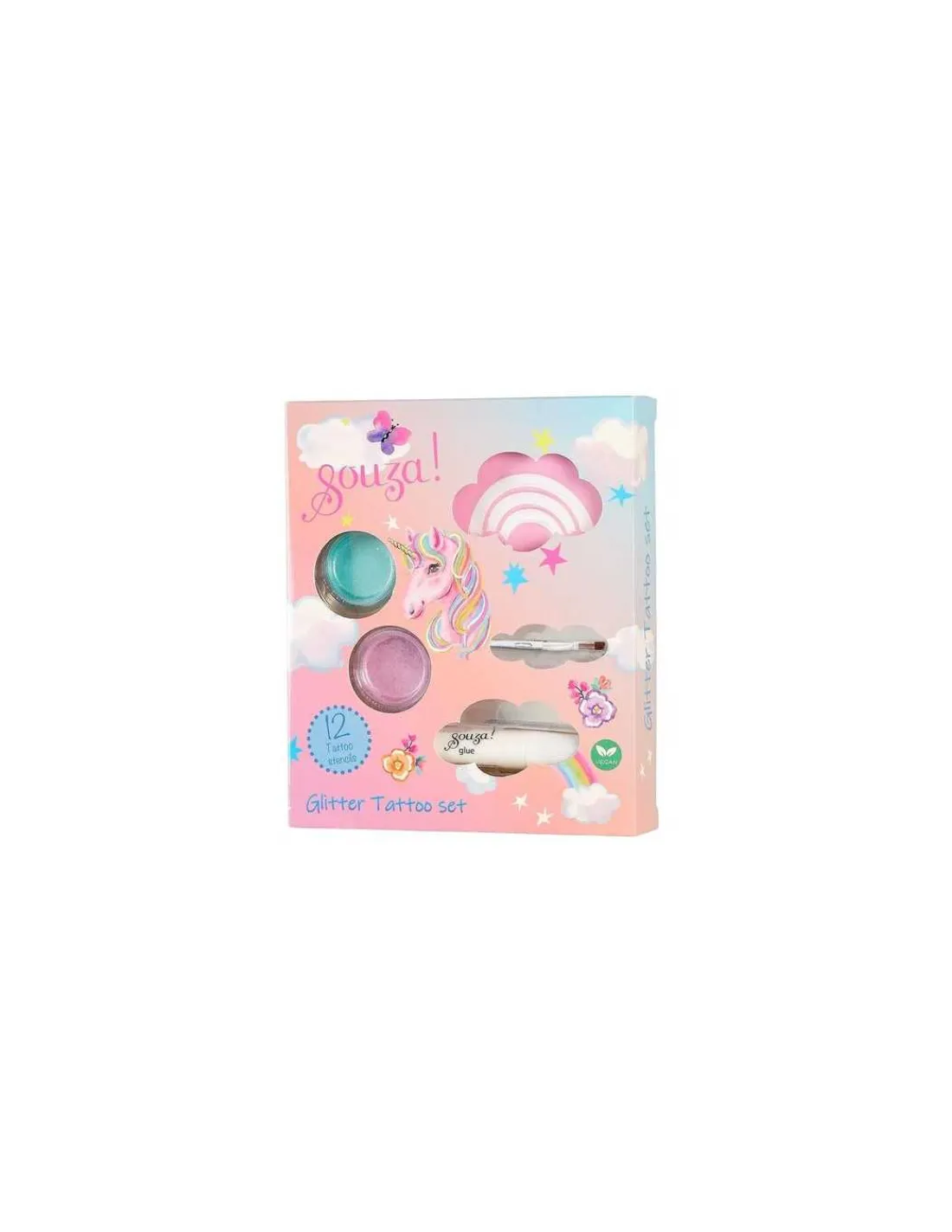 Découvrez le set de tatouages glitter Licorne de Souza, un coffret cadeau de maquillage pour les enfants à partir de 6 ans où vous allez réaliser des tatouages avec des pochoirs sur le thème des licornes.