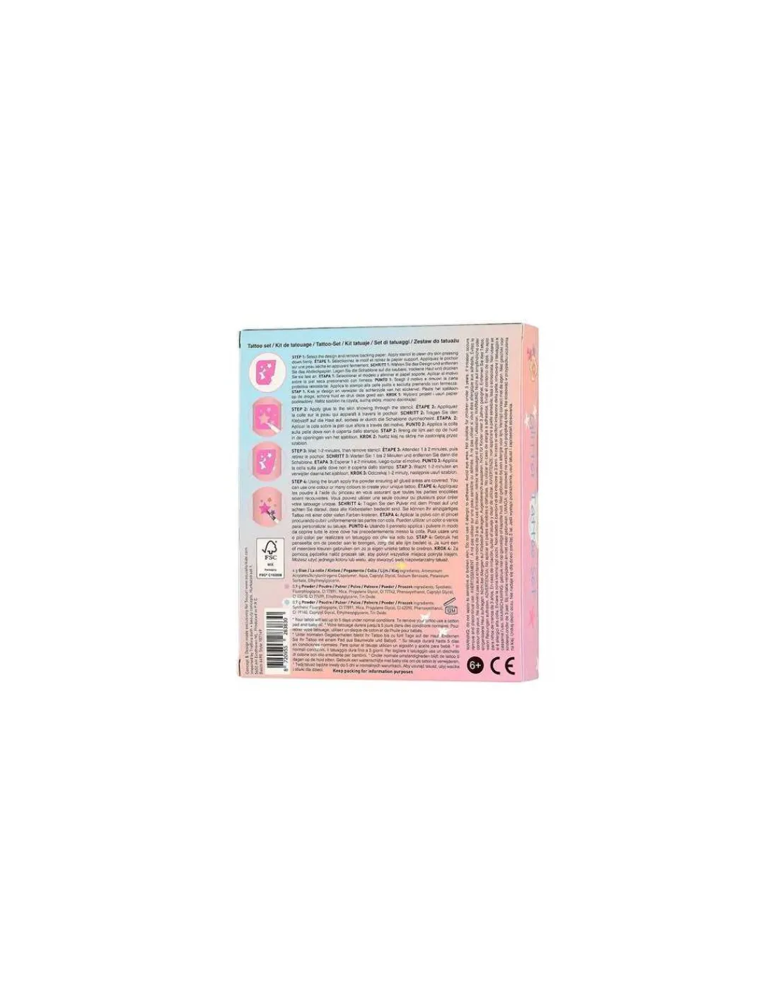 Un très beau coffret de tatouages à offrir en cadeau qui contient un pinceau, un tube de colle, 2 poudres de tatouages et 12 pochoirs.