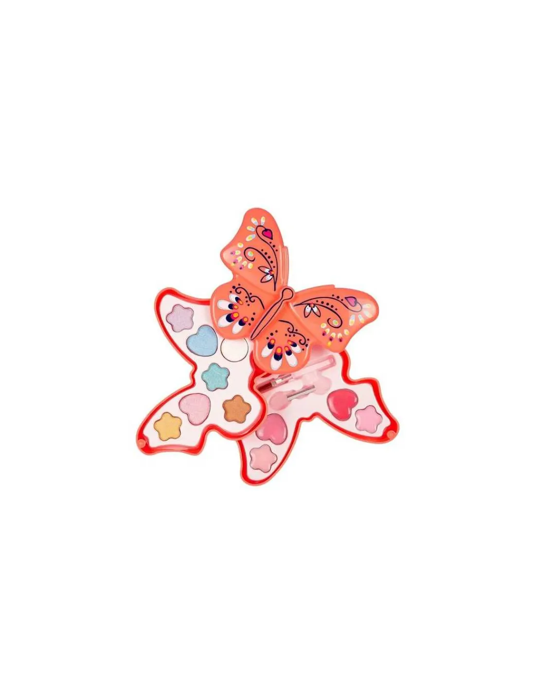 Ce kit de maquillage contient différentes couleurs de fard à paupières te de brillant à lèvres dans un coffret papillon à deux compartiments de maquillage. Un format pratique à emporter partout.