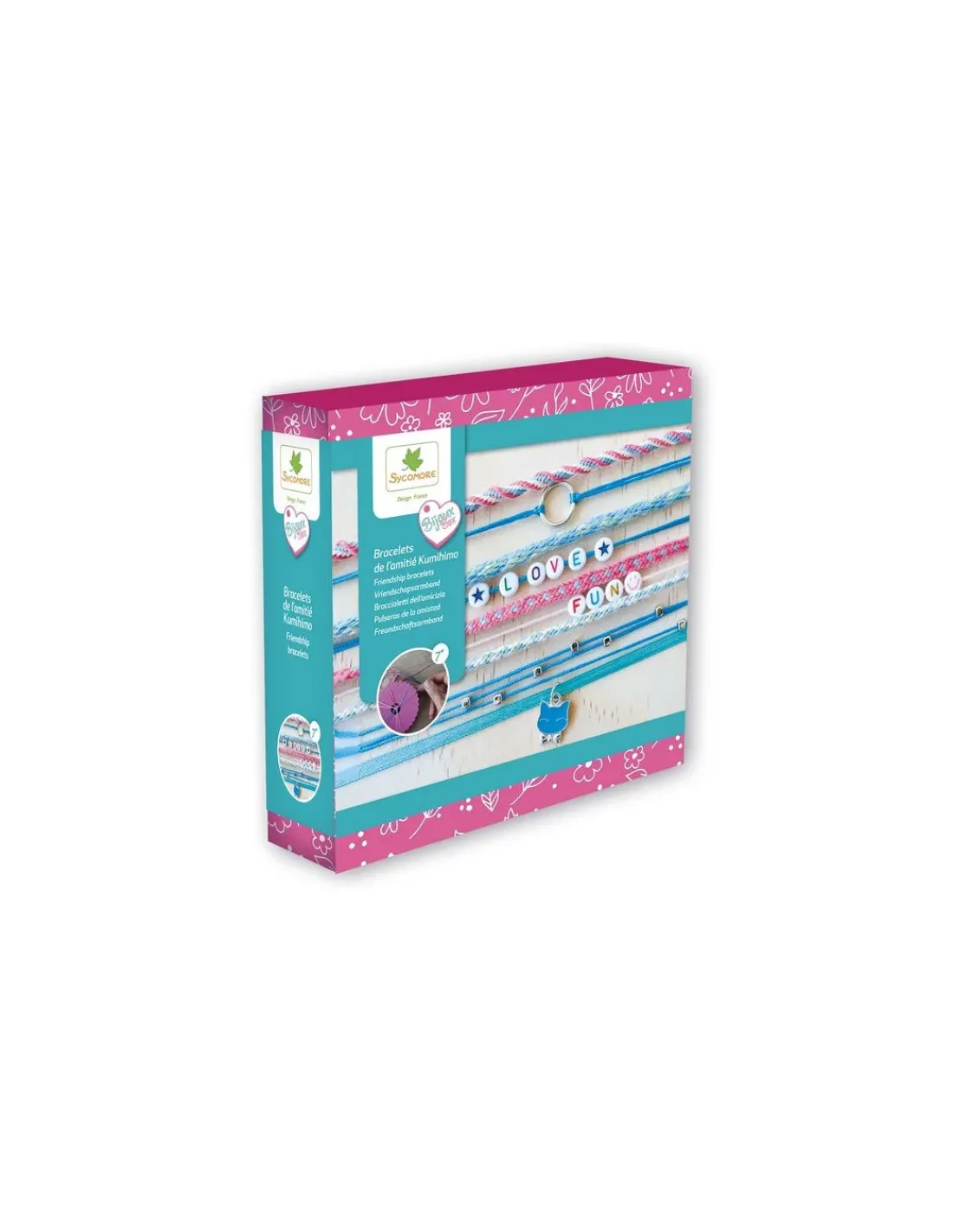 Découvrez le coffret Atelier bracelets de l’amitié Kumihimo de Sycomore, un coffret créatif de la collection Bijoux Box pour les enfants à partir de 7 ans permettant de réaliser de magnifiques bracelets en tressage japonais.