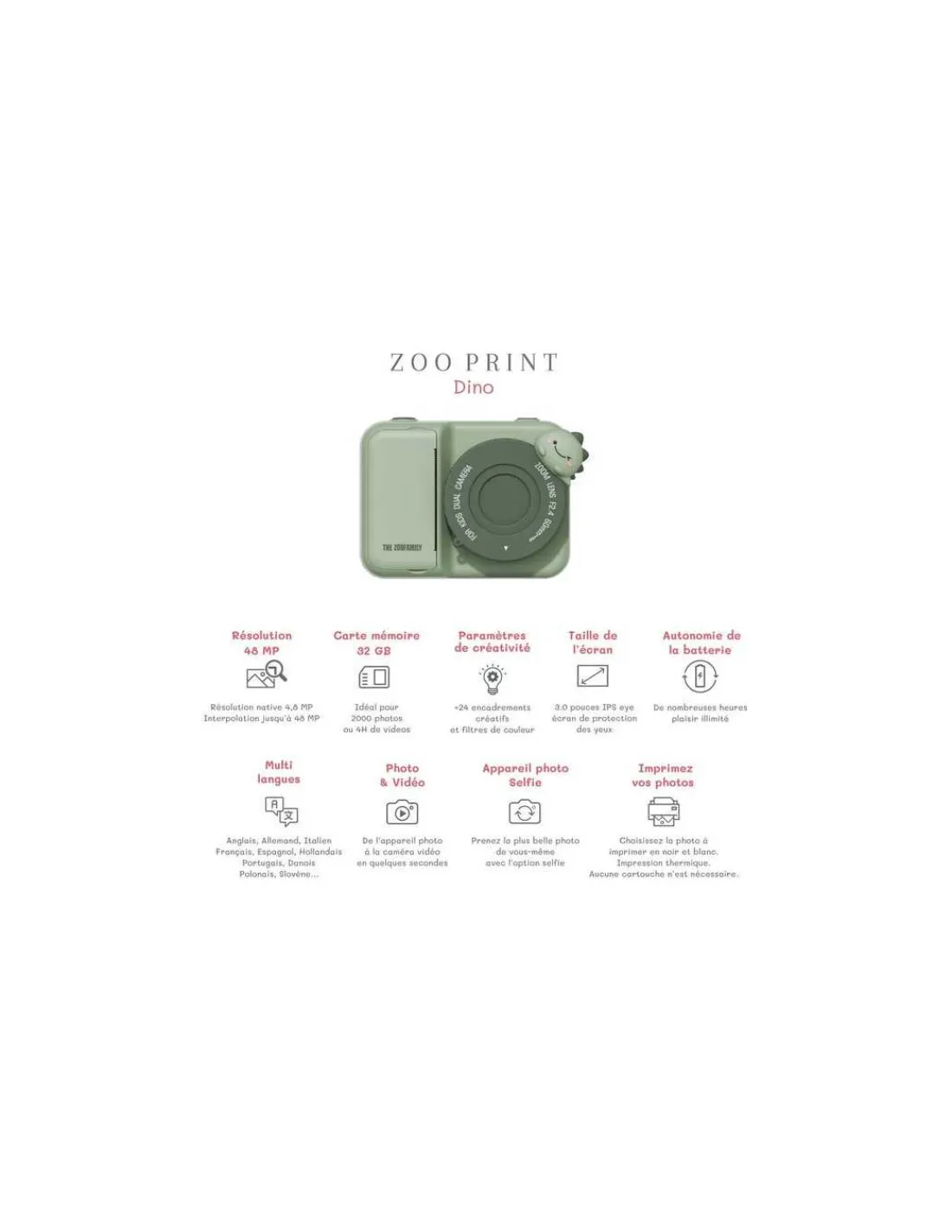 Découvrez l’appareil photo Dinosaure de la collection Zoo Print de The Zoofamily, un appareil photo numérique qui émerveillera les enfants de 5 à 11 ans. Un magnifique cadeau qui leur permettra de capturer les moments les plus précieux, y compris grâce à son option selfie, et de les imprimer facilement.