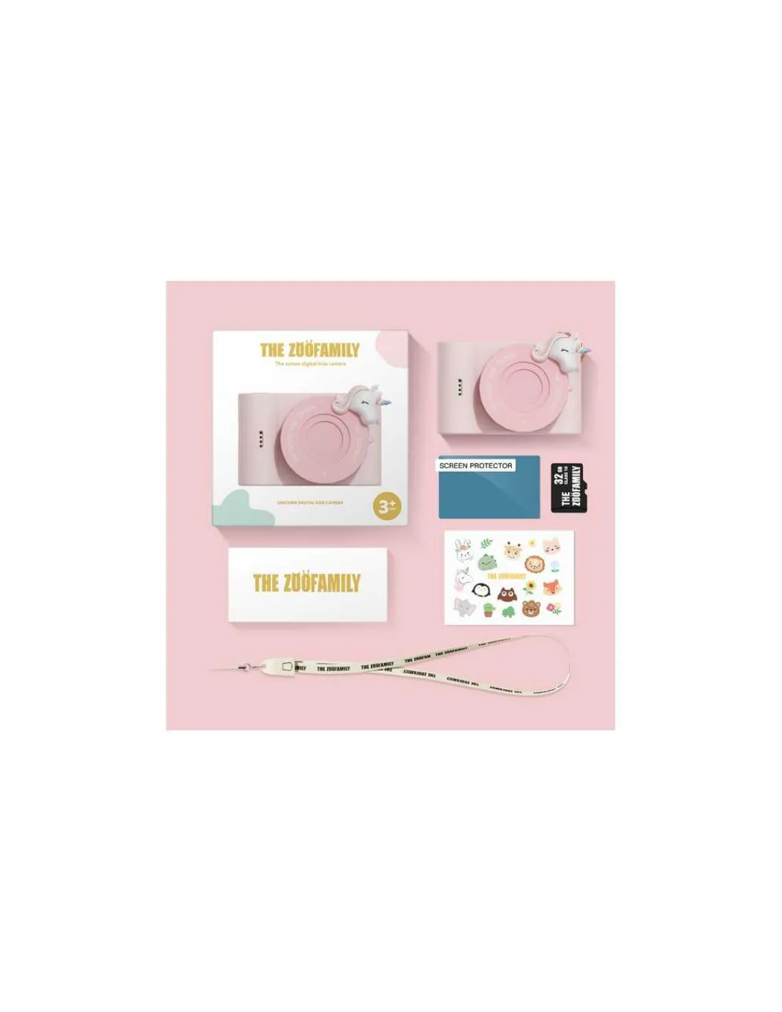 Le coffret comprend l’appareil photo, 1 housse en silicone, 1 cordon et câble de données deux en un, 1 carte haute vitesse MicroSD 32 Go, 1 clé USB de transfert de photos, 1 autocollant pour personnaliser l’appareil photo, 1 protection de l’écran de l’appareil photo et 1 manuel de l’utilisateur.
