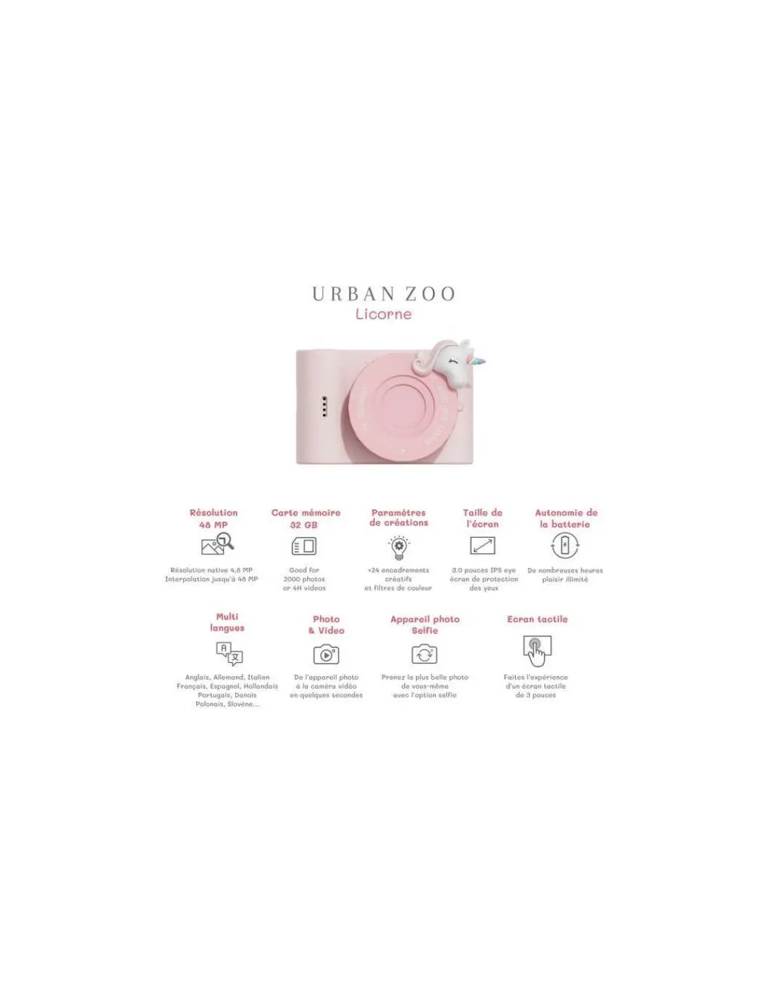 Découvrez l’appareil photo Periwinkle La Licorne de la collection Urban Zoo de The Zoofamily, un appareil photo numérique qui émerveillera les enfants de 5 à 10 ans. Doté d’une résolution Full HD, il capturera les moments les plus précieux avec des détails saisissants et des couleurs éclatantes, y compris grâce à son option selfie.