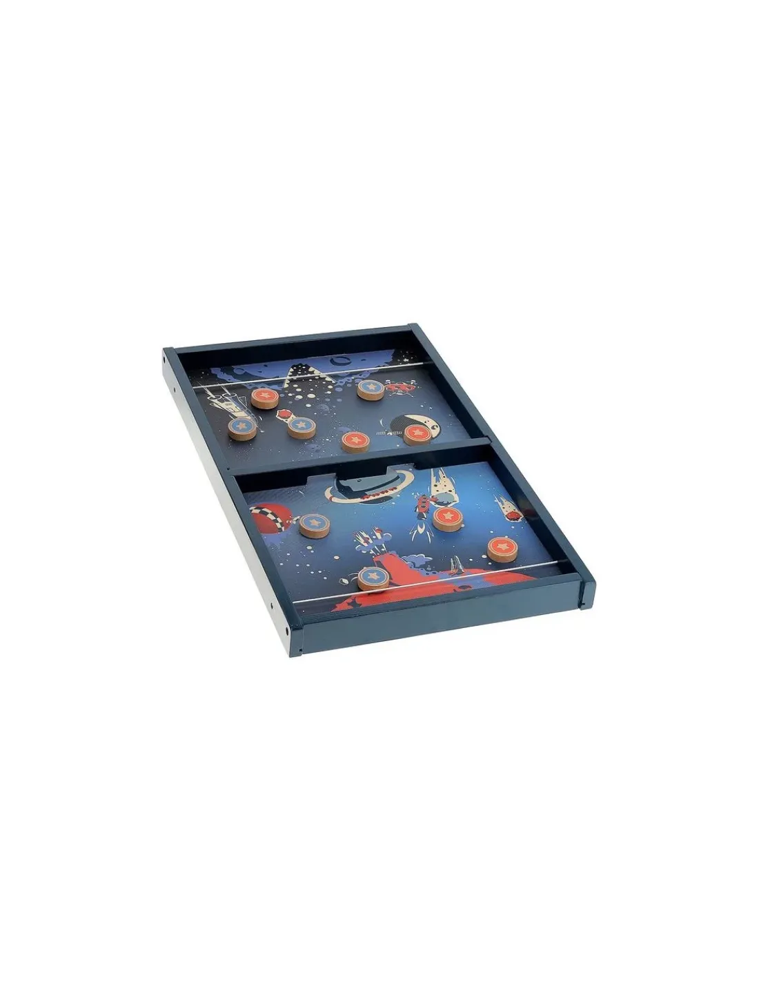 Voyagez dans l’espace, à bord du vaisseau Vilac dans ce magnifique jeu de palet au look vintage. Le but est de se débarrasser de tous ses palets avant son adversaire ou, encore plus difficile, de ne plus avoir un seul palet de son côté. Il faut se servir de l’élastique de son côté comme lanceur et être le plus habile pour viser l’unique trou au centre du jeu. Pour les meilleurs tireurs, un autre obstacle avec 2 trous décentrés peut se substituer au centre.