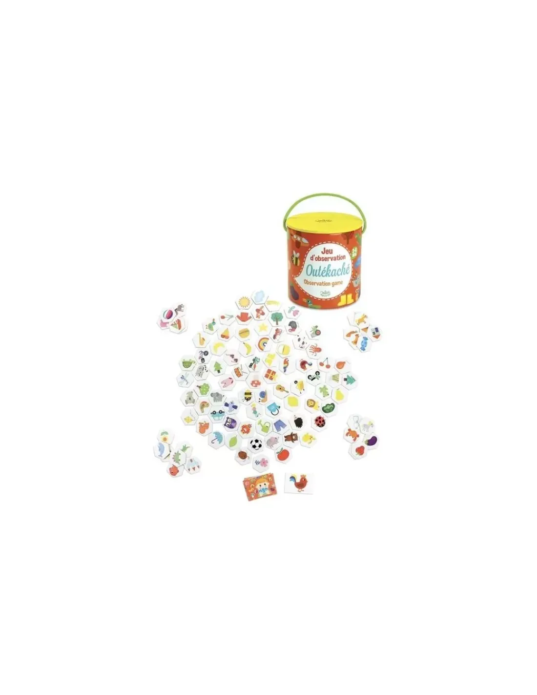 Découvrez le jeu Outékaché de Vilac, un jeu d’observation pour les enfants à partir de 3 ans. Placez les images face visible et essayez de retrouver l’illustration en premier.