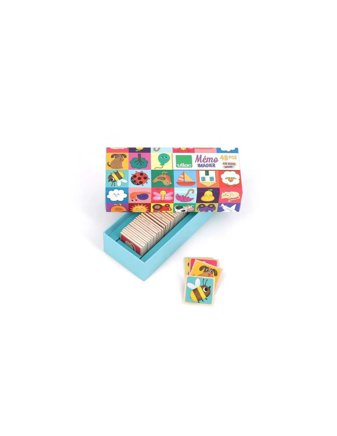 Découvrez le jeu Mémo 48 pièces en bois de Vilac illustré par Mélusine Allirol, un jeu éducatif avec 24 paires à reconstituer à partir de 2 ans avec de splendides illustrations.