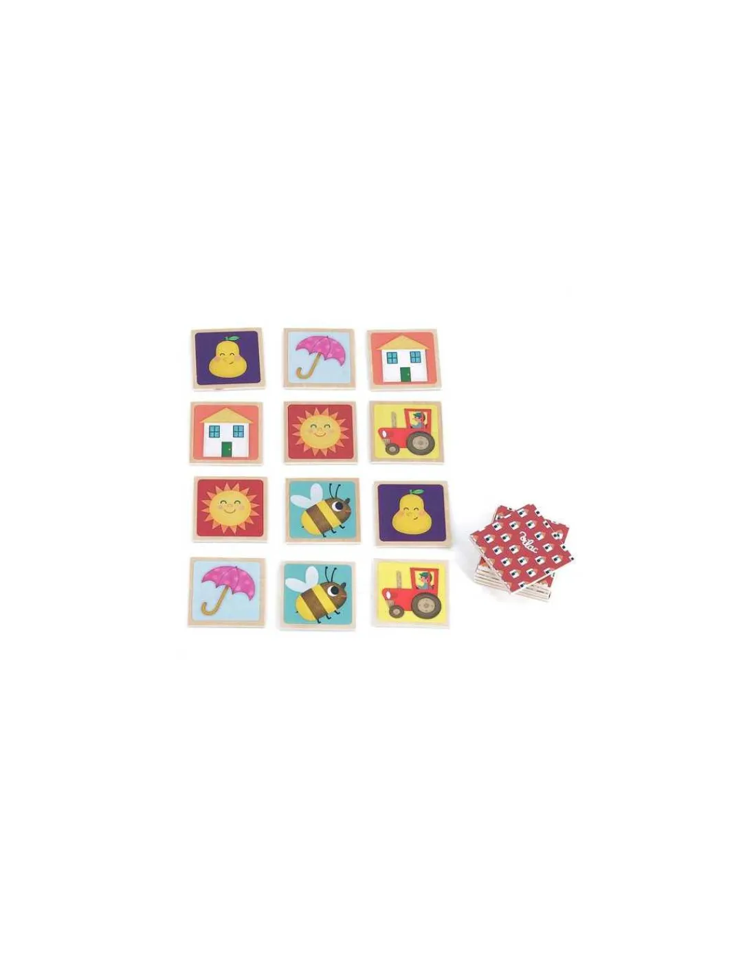 Un jeu de mémoire qui permettra aux enfants d’enrichir leur vocabulaire et leur mémoire pour reconstituer les 24 paires! Retrouvez le tracteur, la vache, la voiture, la pomme etc… Une expérience d’apprentissage amusante et stimulante pour les enfants dès 2 ans. Un jouet durable de 48 pièces en bois présenté dans un coffret.