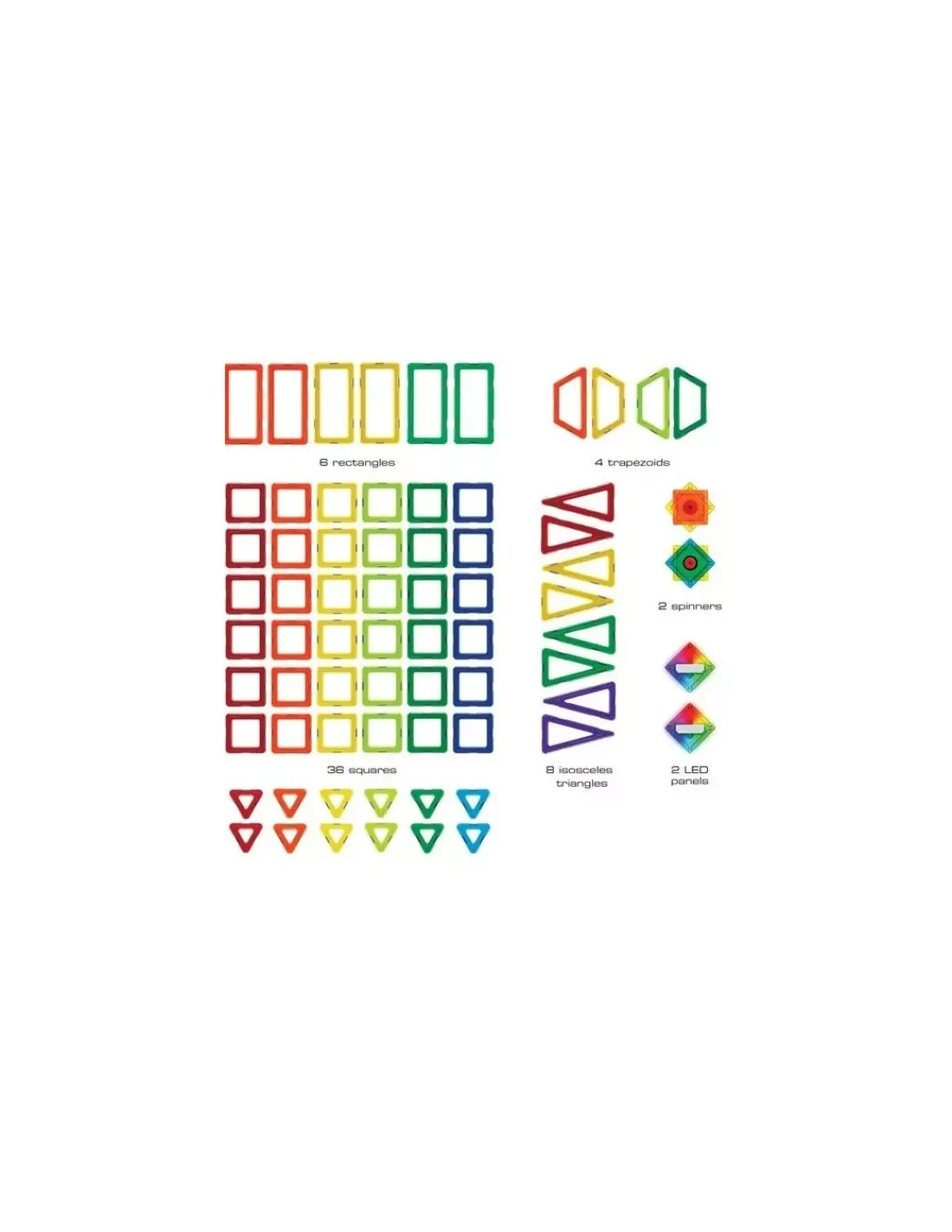 La boite contient 36 carrés, 12 triangles, 6 rectangles, 4 trapèzes, 8 tiangles isocèles, 2 pièces lumineuses LED 6 couleurs et 2 girouettes