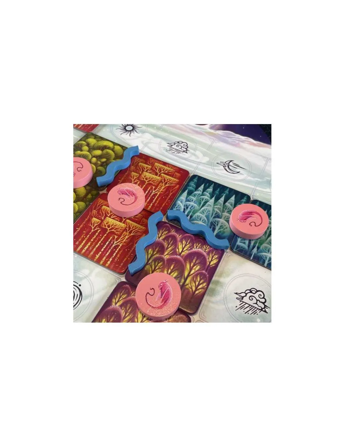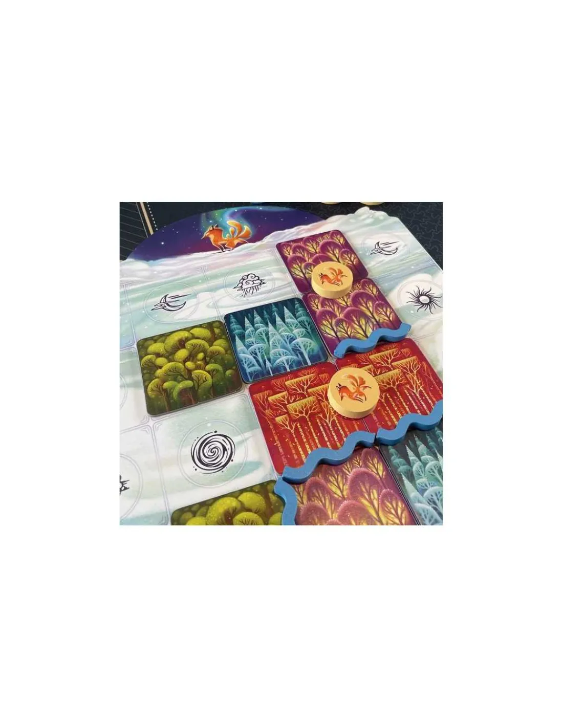 La boite de jeu contient 60 tuiles « Forêt », 24 pions « Rivière », 48 pions « Animal », 8 tuiles « Aurore », 33 cartes « Objectif », 1 plateau central, 4 plateaux « Joueur » et la règle du jeu.
