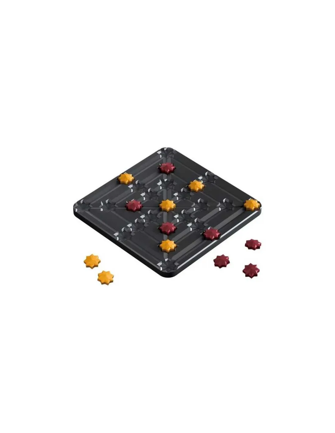 Le jeu contient 1 plateau de jeu comportant 25 emplacements, 7 pions « Étoile » clairs, 7 pions « Étoile » foncés, un sac de rangement, la règle du jeu.