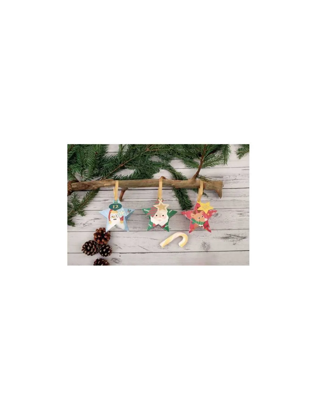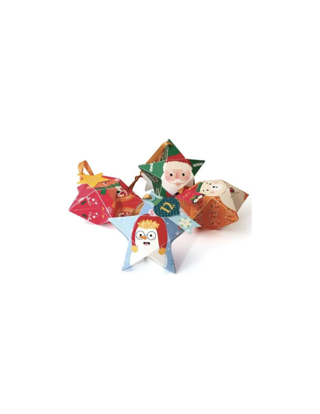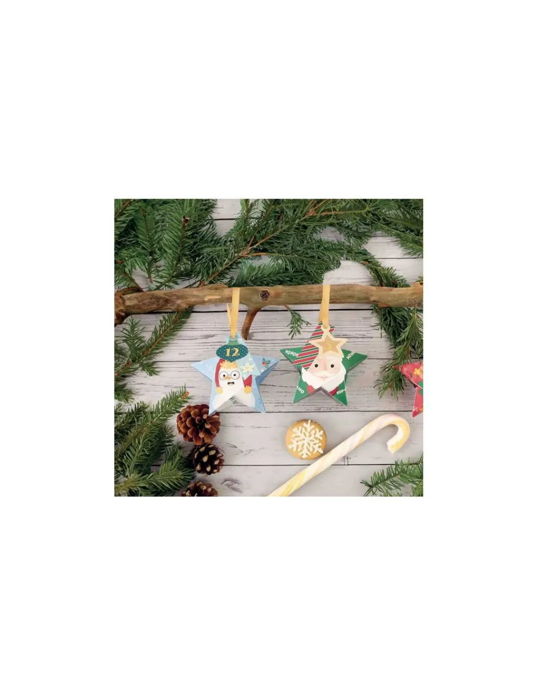 Ce kit permet de créer un calendrier de l’Avent unique et personnalisé, composé de 24 boîtes en papier imprimées en forme d’étoile. Chaque boîte est conçue pour contenir un petit cadeau ou une surprise, et peut être suspendue à l’aide du ruban inclus ou disposée dans une boîte. Le kit comprend 24 boîtes imprimées en couleur à monter, une planche de stickers chiffres dorés pour numéroter chaque jour et un ruban pour les suspendre.