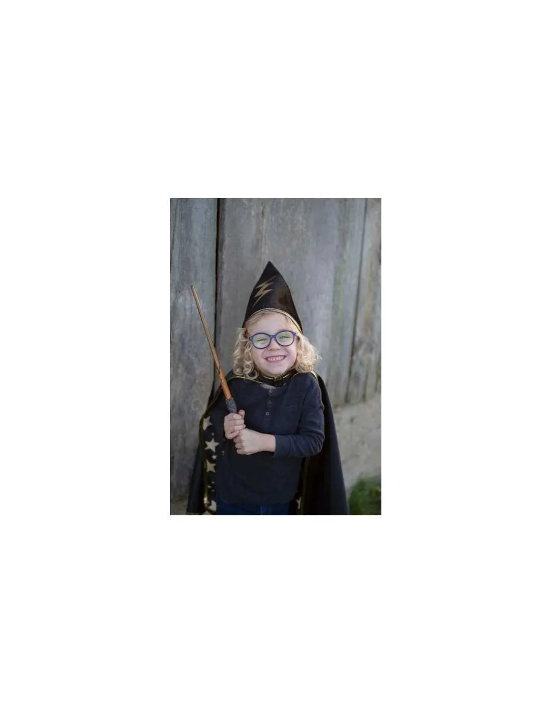 Une cape réversible fait d’un beau tissu de qualité très soyeux illustré d’un côté avec un éclair et de l’autre avec de belles étoiles dorées. Le chapeau de sorcier comporte une mentonnière élastique douce pour maintenir le chapeau en place sur la tête de l’enfant, pendant que celui-ci lance des sorts.