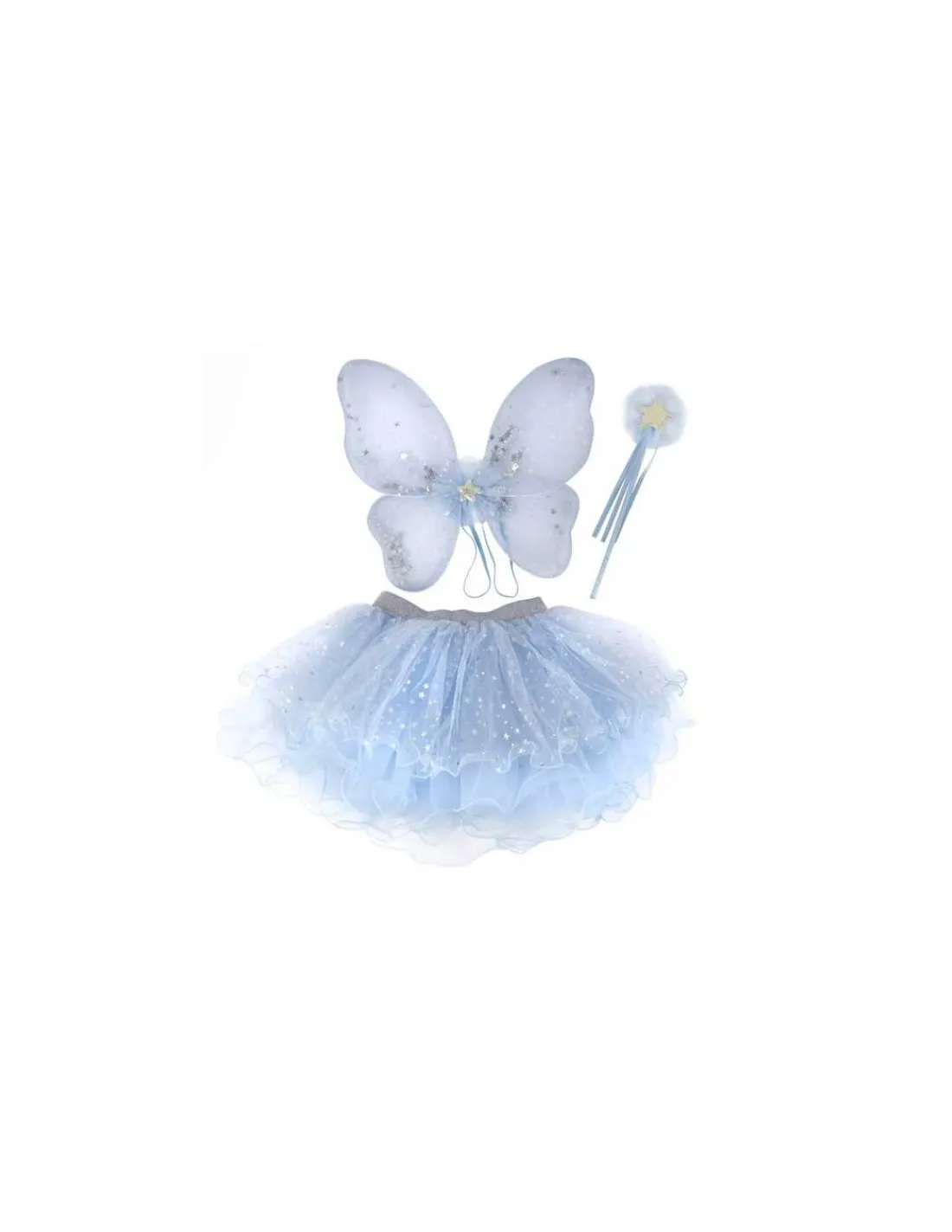Pour couronner le tout, une baguette magique assortie, ornée d’une grande étoile brillante en son centre, est enveloppée de volants en tulle bleu moelleux pour une touche ludique.