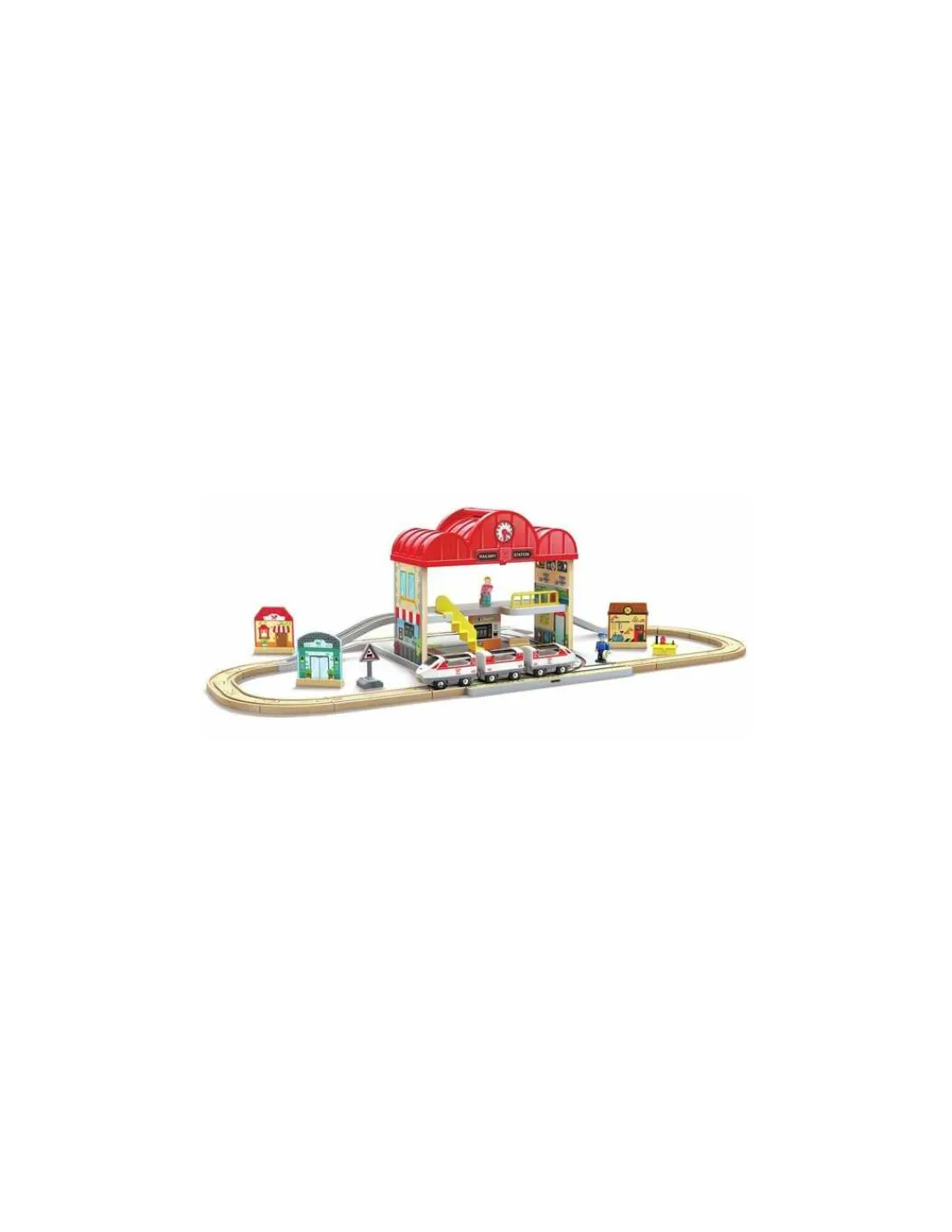 Ce magnifique circuit de train est composé de 41 pièces. Les détails soignés, tels que la gare et les figurines qui peuvent prendre place dans le train, ajoutent une dimension narrative qui enrichit l’expérience de jeu et renforce les compétences sociales des enfants.