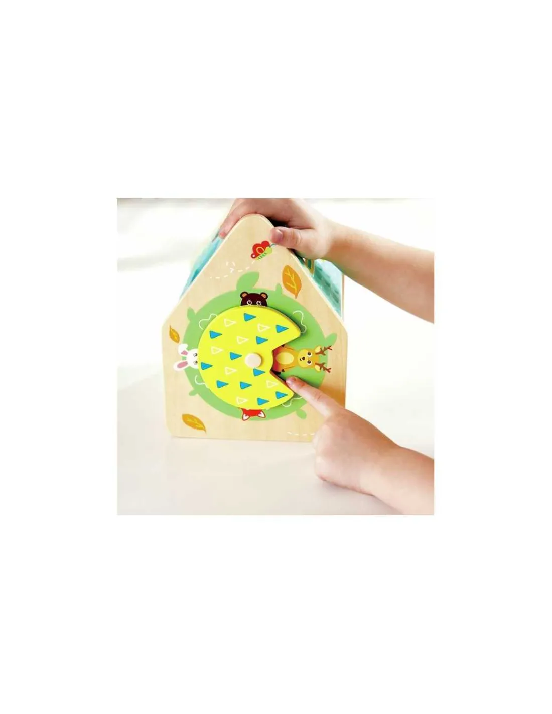 Découvrez la maison trieuse de formes Les amis de la forêt de Hape, un jouet d’éveil en bois pour les enfants dès 24 mois, avec 4 blocs géométriques et 4 figurines sur le thème de la forêt.