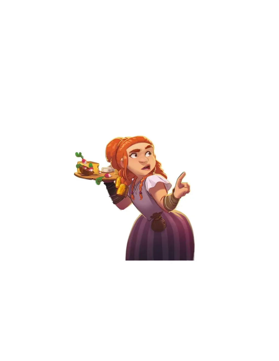 La boite de jeu 40 cartes Service (32 cartes Plateau, 8 cartes Personnage), 6 dés (3 dés jaunes, 3 dés orange), 7 pions Meule en bois et 1 livret de règles.