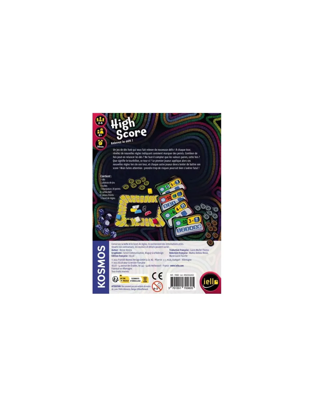 Découvrez le jeu High score de Iello, un jeu de dés futé qui vous fait relever de nouveaux défis à partir de 8 ans. Un renouveau du classique Yams avec des parties remplies de choix et de défis. Un jeu de Dés en stop ou encore idéal entre amis ou en famille.
