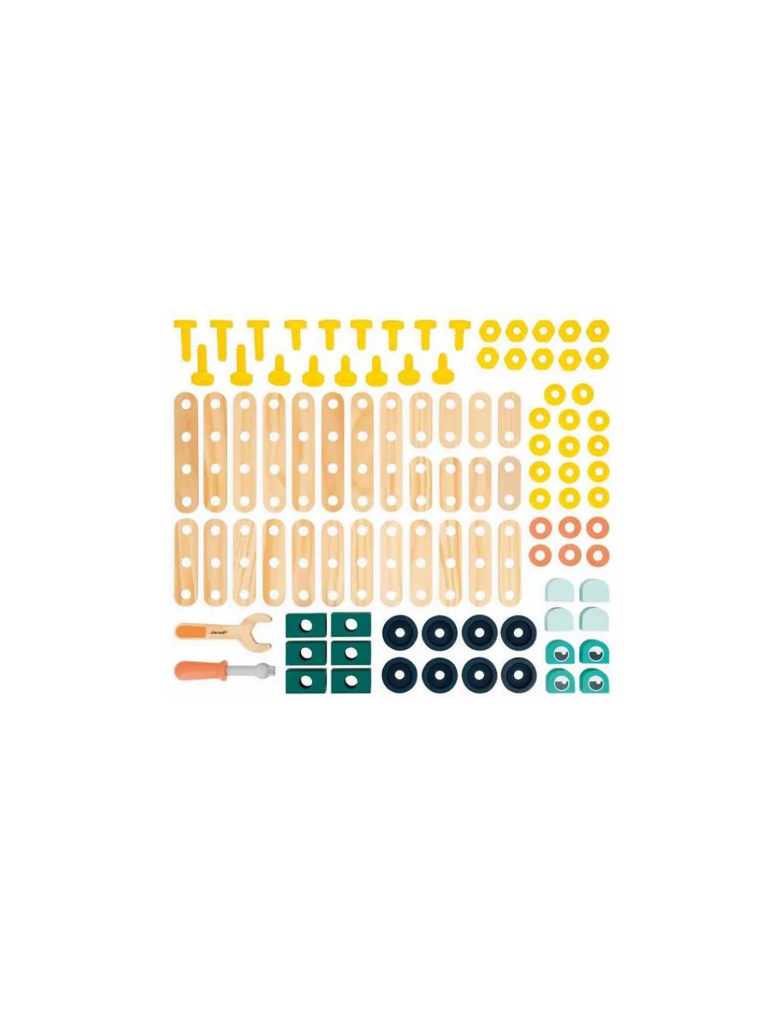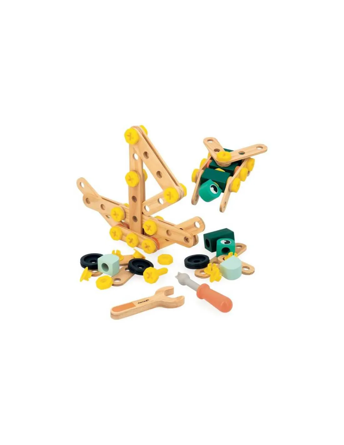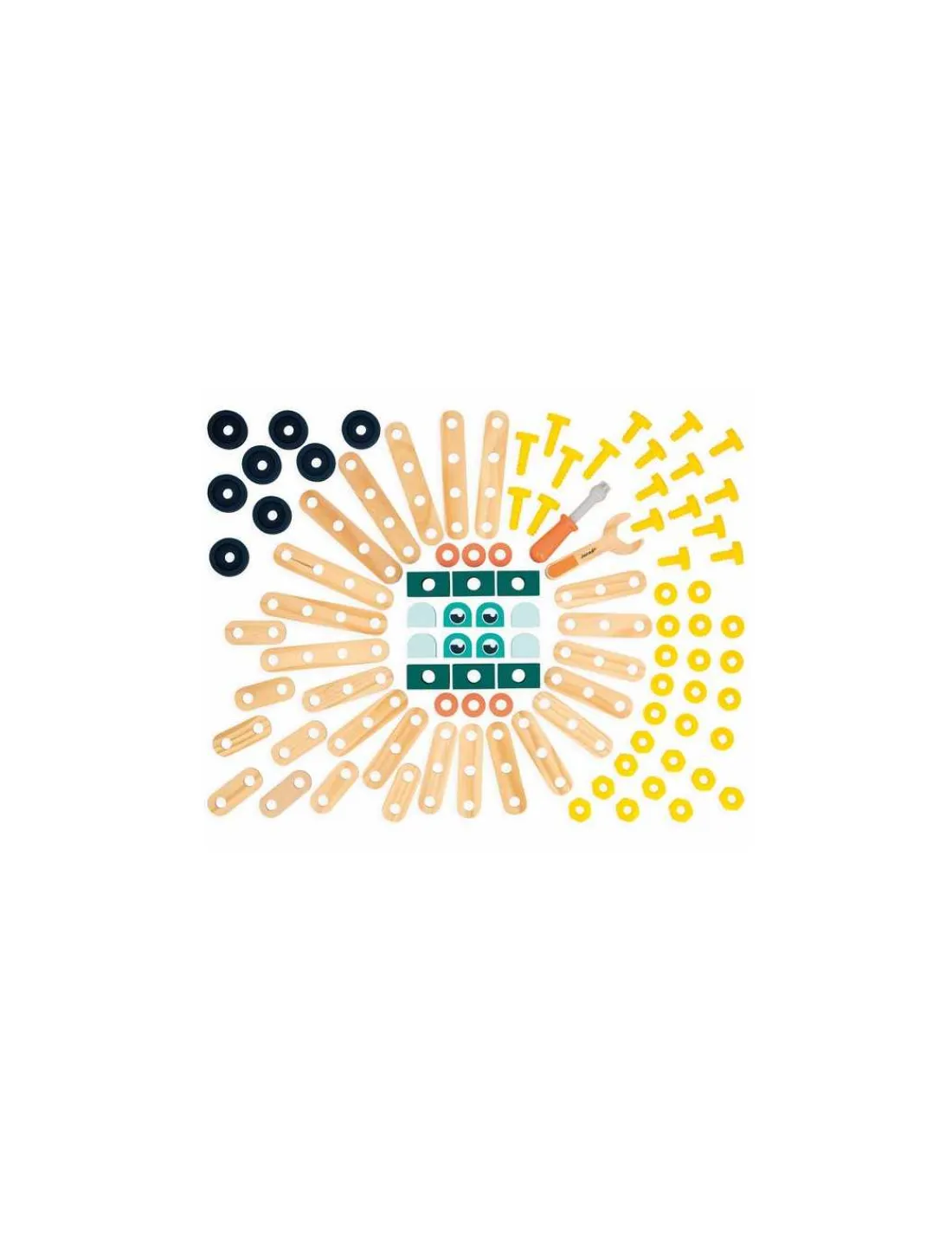 Le coffret comprend 2 outils, 60 pièces en bois, 14 vis en plastique, 14 écrous en plastique, 10 inserts en plastique, 10 cartes modèles avec des constructions à reproduire.