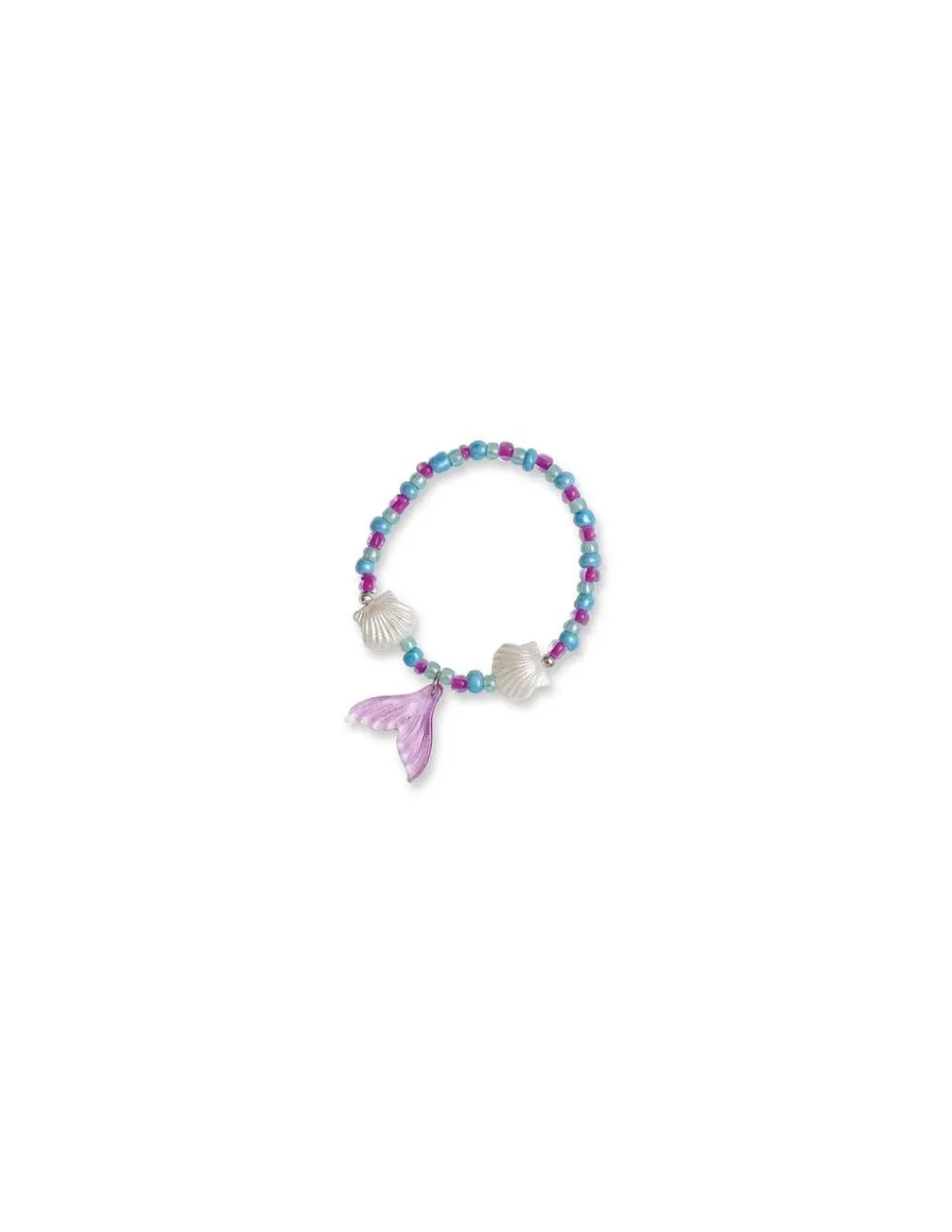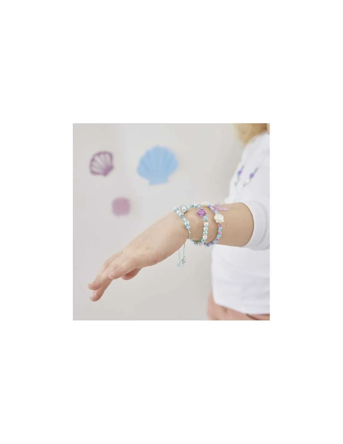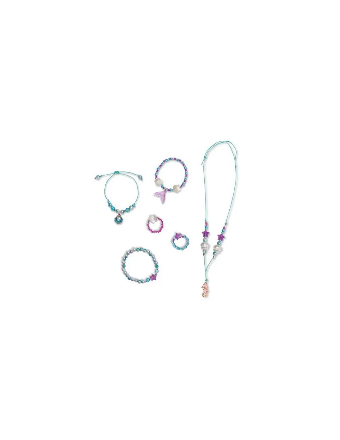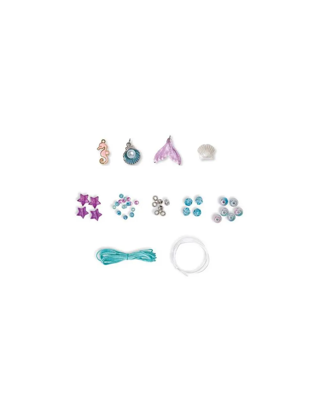 Le coffret comprend le matériel nécessaire pour réaliser 6 bijoux avec de jolies perles : 2 bagues en perles de rocaille, 3 bracelets avec des perles irisées et des petites breloques (coquillage, étoile de mer et queue de sirène) et 1 collier en fil avec une breloque hippocampe.