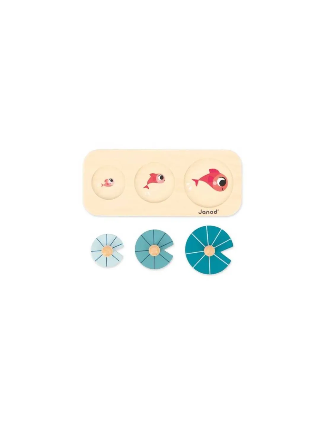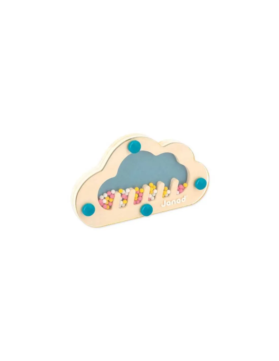En ouvrant cette belle boite colorée, vous trouverez un bâton de pluie en forme de nuage, un puzzle à encastrer avec des pièces à tenons en forme de nénuphars, des cubes à empiler de forme ronde avec des figurines canards Chunky et une boite à formes sensorielle avec 3 grenouilles à encastrer possédant chacune une fonction sensorielle différente (vitre colorée, miroir, perles). Cette boite en forme de grenouille renferme également 3 tissus aux textures différentes, que votre enfant pourra récupérer grâce à une trappe avec plan incliné.
