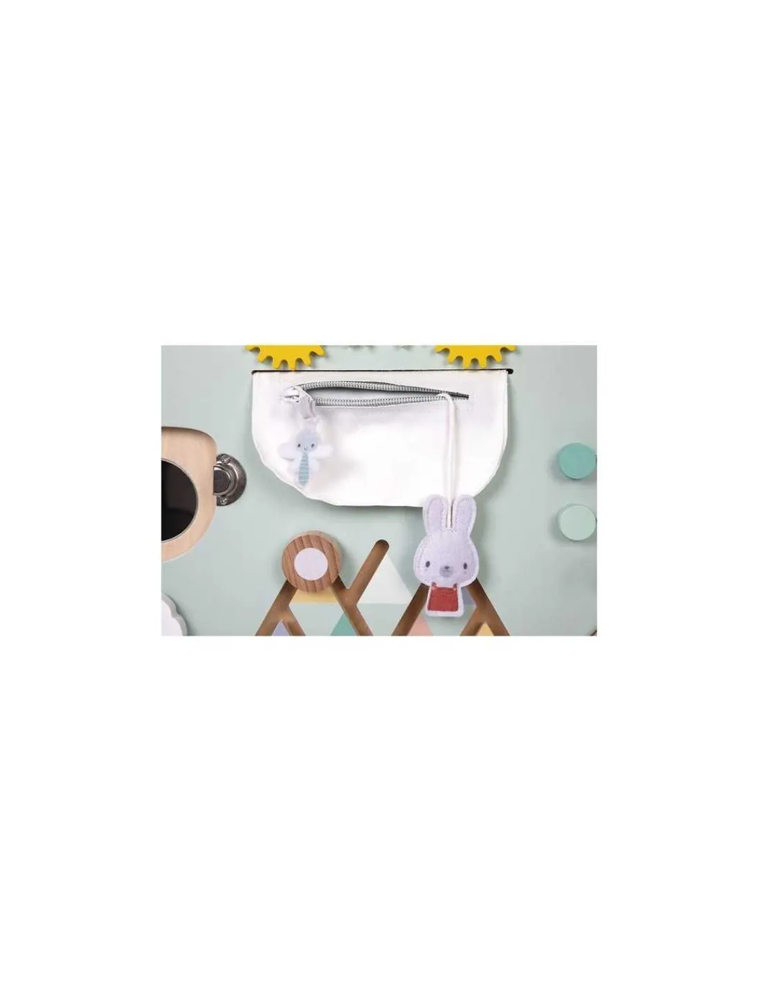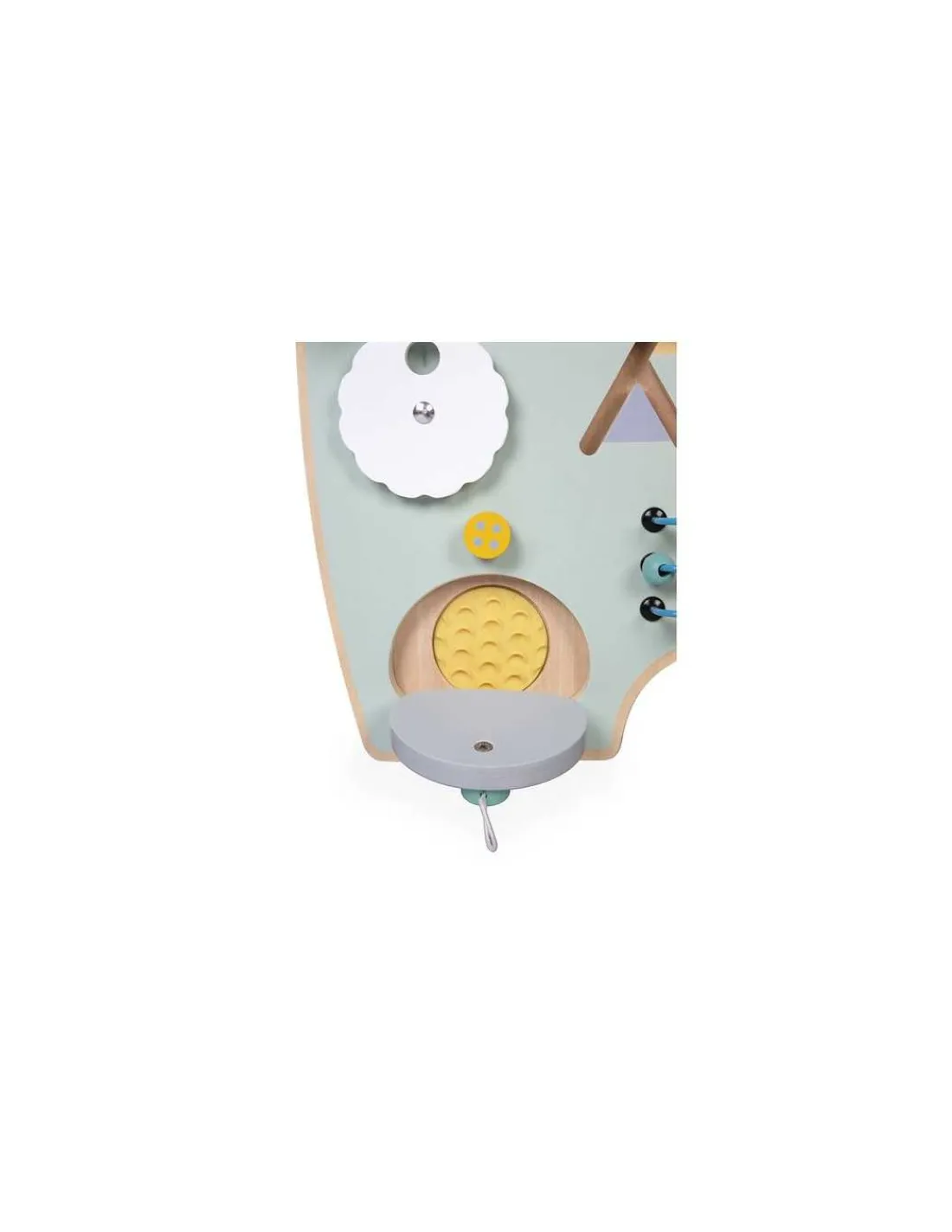 Ce panneau d’activités s’accroche au mur et permet aux enfants de développer leur motricité fine et leur dextérité de façon ludique. Il comprend 20 activités : une abeille qui fait tinter la cloche, une castagnette, des yeux rotatifs, un nez rotatif sonore, des joues en feutrine, des engrenages, une sangle ouverture métal, une sangle ouverture velcro, une poche centrale avec fermeture éclair où vient se ranger un lapin, une serrure ouvrant une porte cachant un miroir, une fleur rotative laissant apparaitre les chiffres de 0 à 9, un labyrinthe, des lacets, un sablier, un boulier et un système de boutons avec élastique cachant 2 surfaces tactiles en silicone.